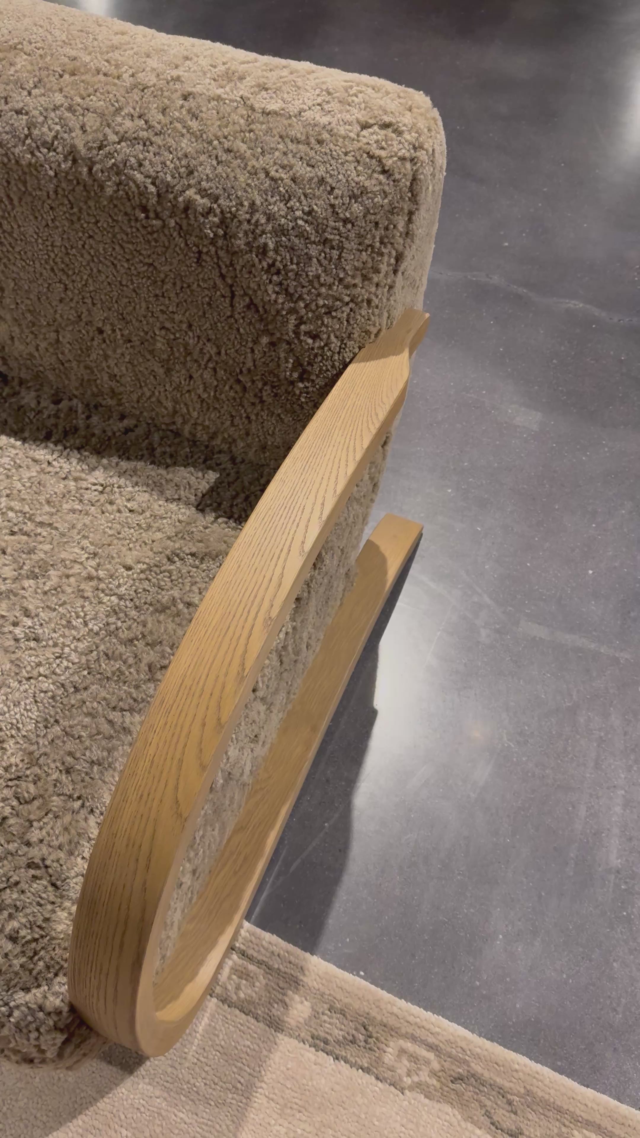 Soft texture and eye-catching contours fuse in this comfort-driven accent chair, pairing a low, luxurious shearling seat and dramatic bent wood frame.