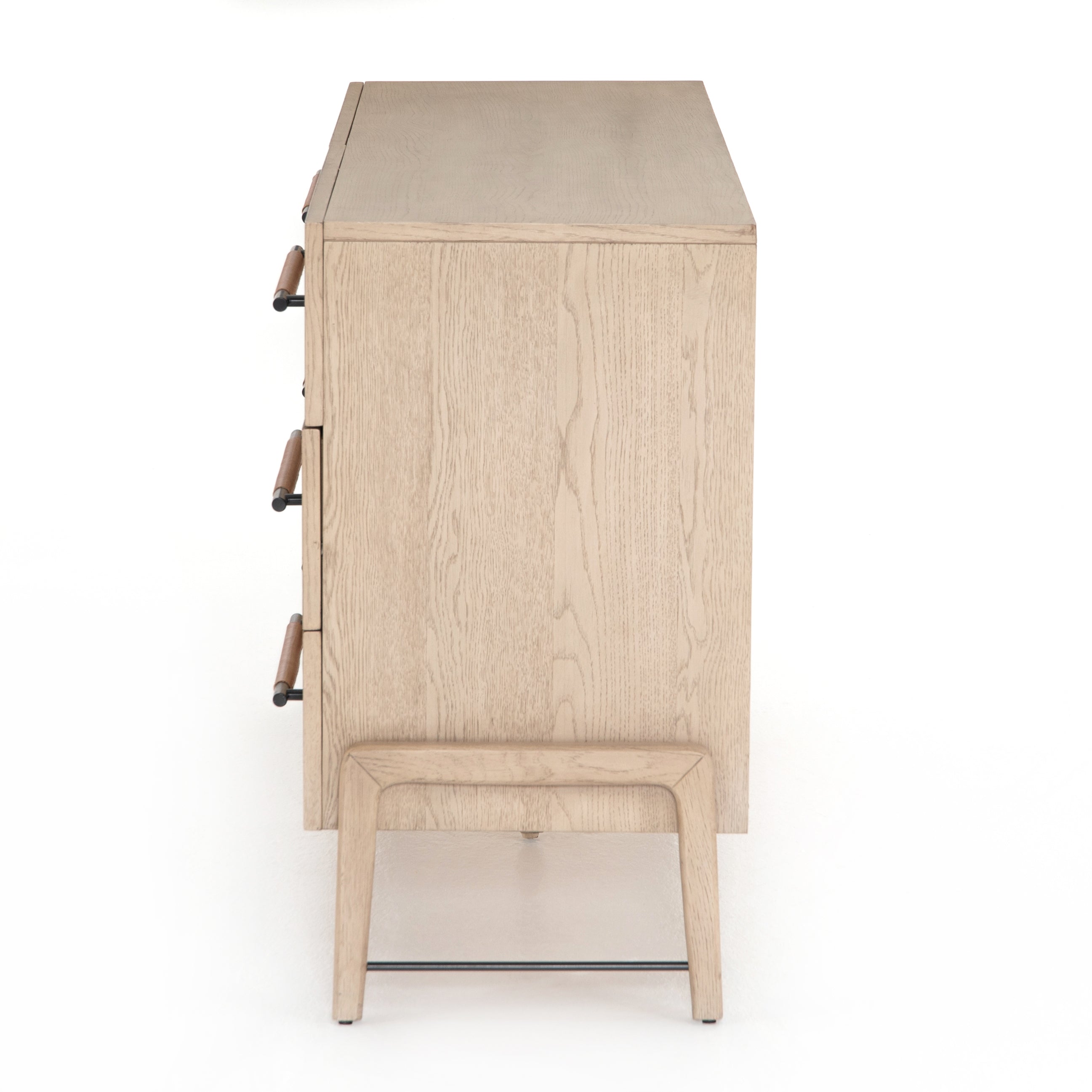 The light-finished oak of this Rosedale 6 Drawer Dresser brings a clean, brightness to any room. With six spacious drawers and iron hardware wrapped in a gorgeous, tan leather, this is a functional and beautiful piece to add to your bedroom or other area.
