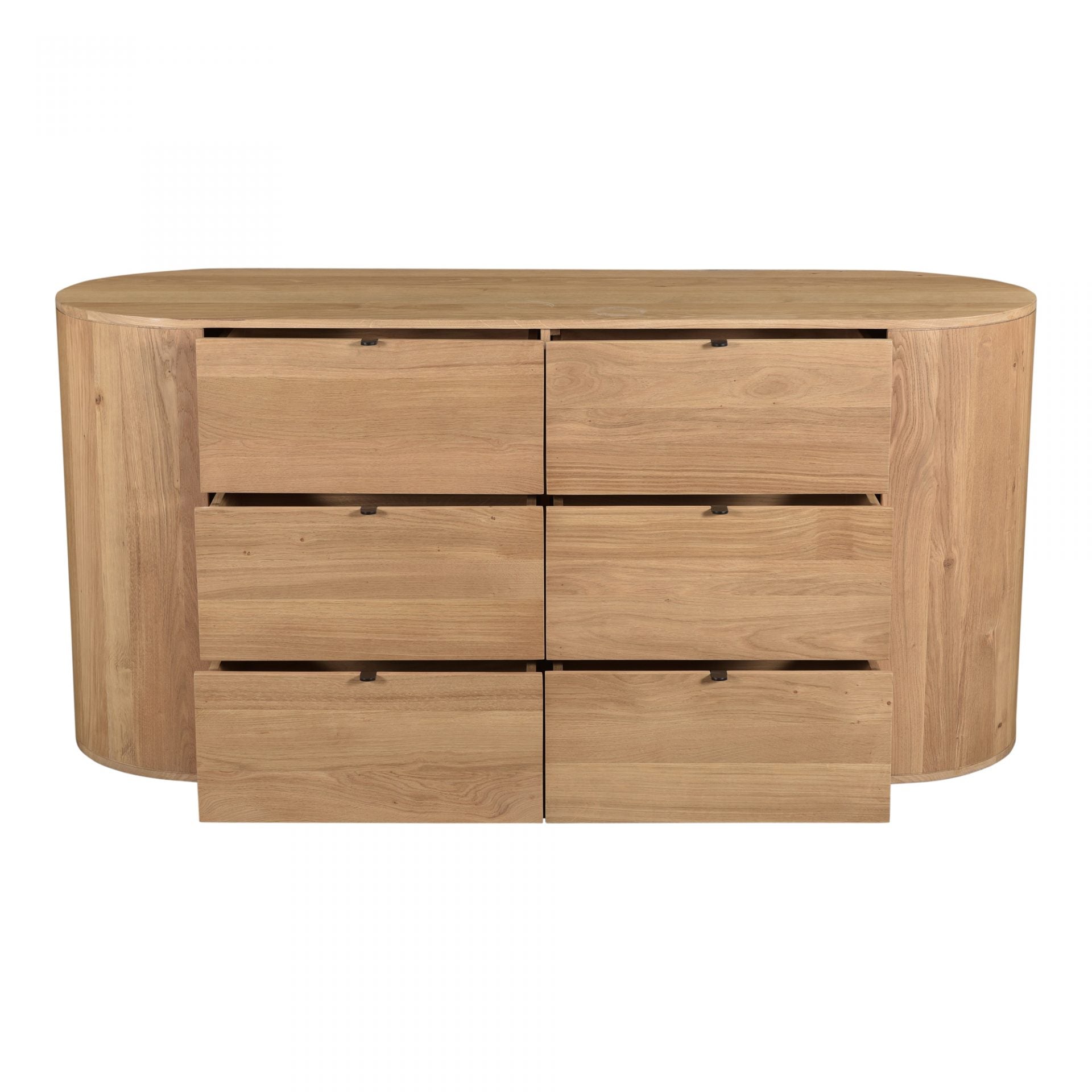 Crafted from solid oak with a natural semi-gloss finish, the Theo Dresser is a natural beauty. The six drawers are deep and soft-closing - the perfect combo for a bedroom dresser!  Size: 66"W x 22.5"D x 31.5"H Material: Solid Oak