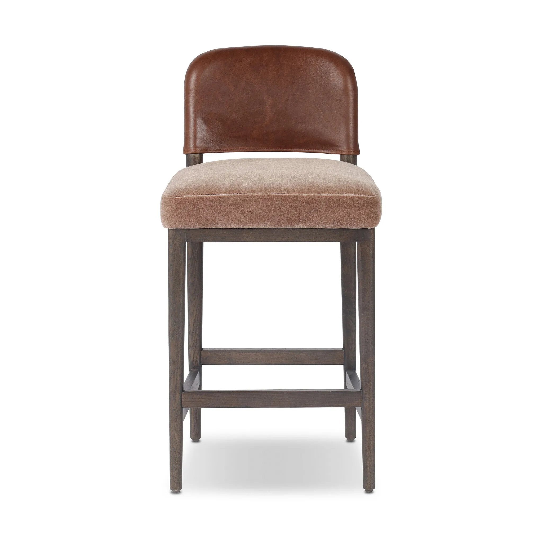 A moody, mixed material stool that stands out. A velvety, wool-blend seat and top-grain leather, seat back are framed by solid ash. Perfectly sized for the counter.