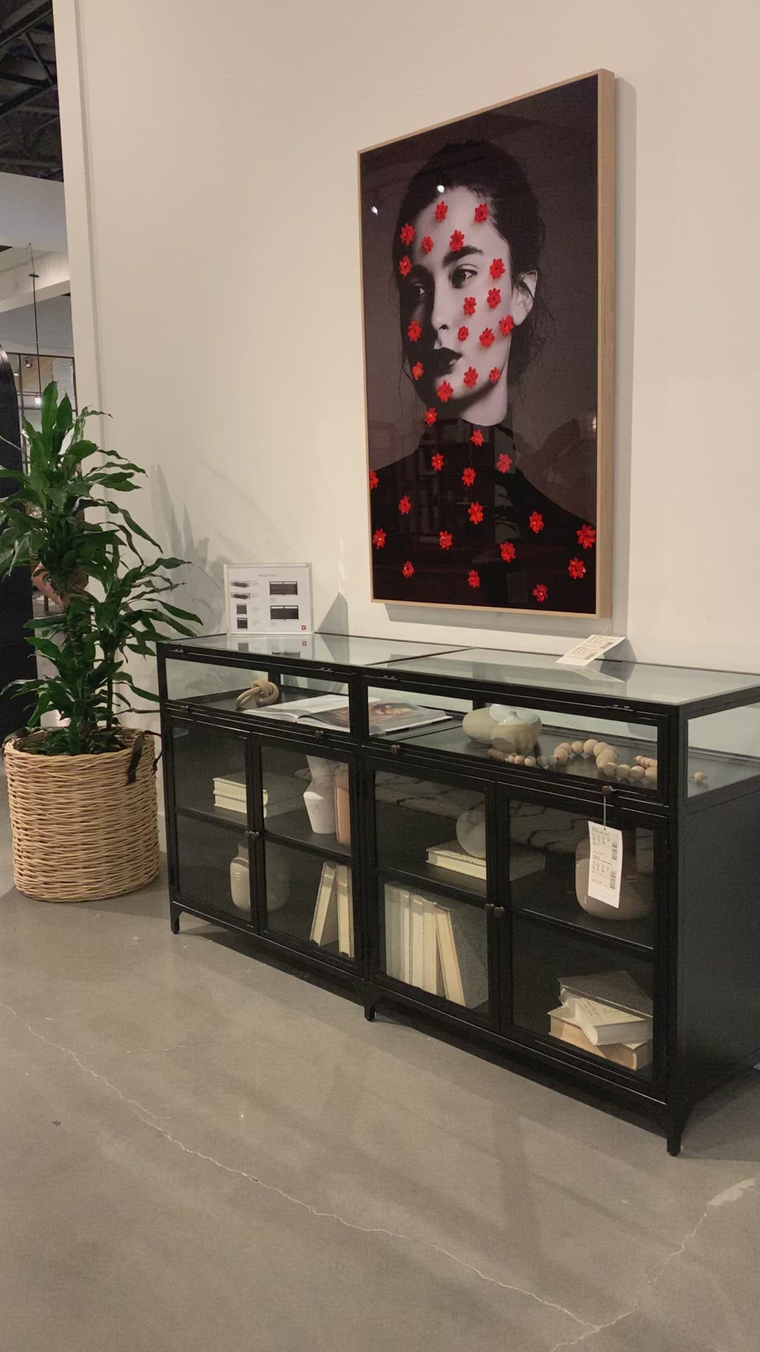 This Shadow Box Sideboard gives your inner collector a place to play. Store prized possessions behind clear glass fronts, with black-finished metal casing and brass hardware for contrast.