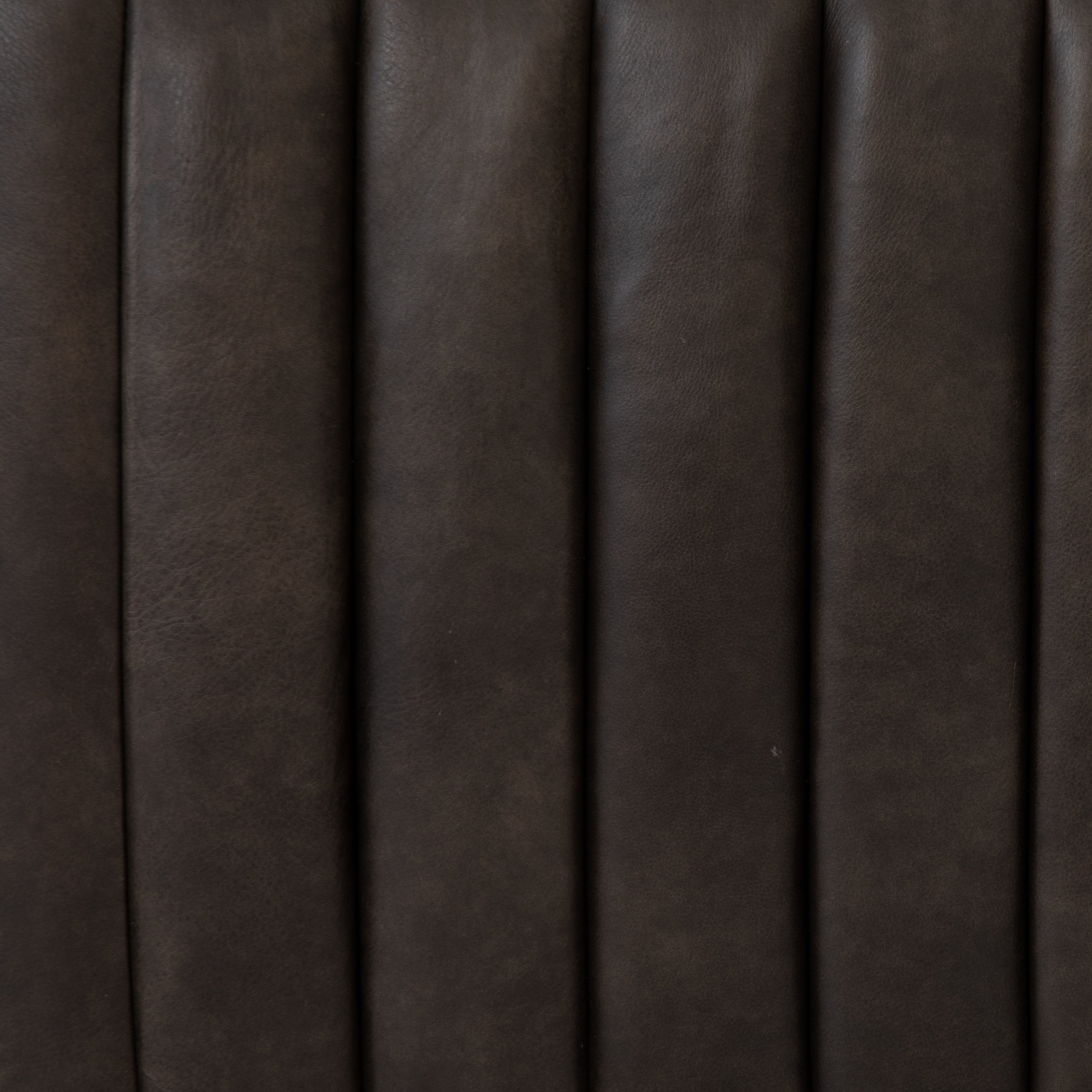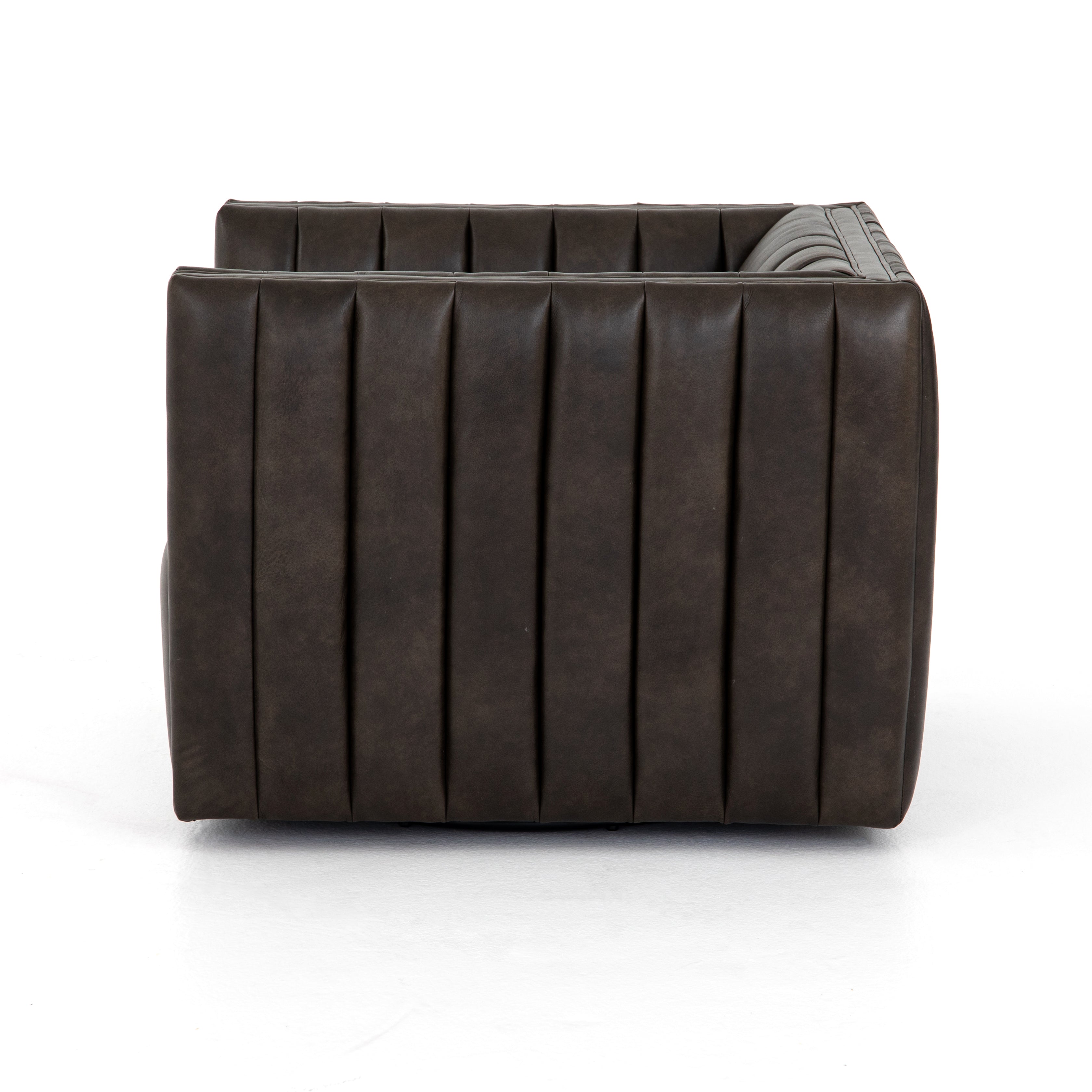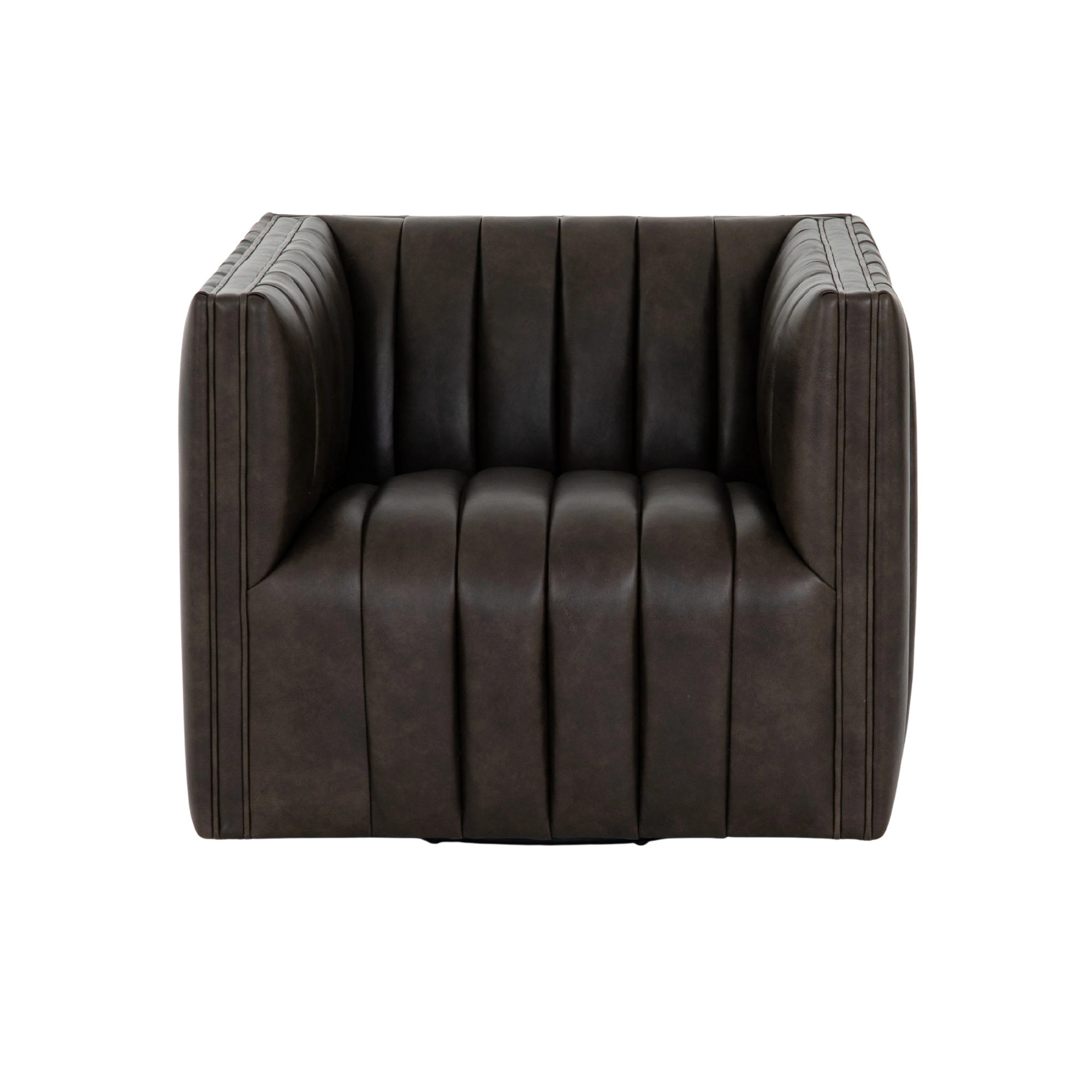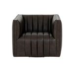 Upholstered in dreamy "wolf" leather -- this swivel chair is the perfect blend of chocolate and grey tones.  Channeled leather makes for a structured, comfortable sit.