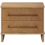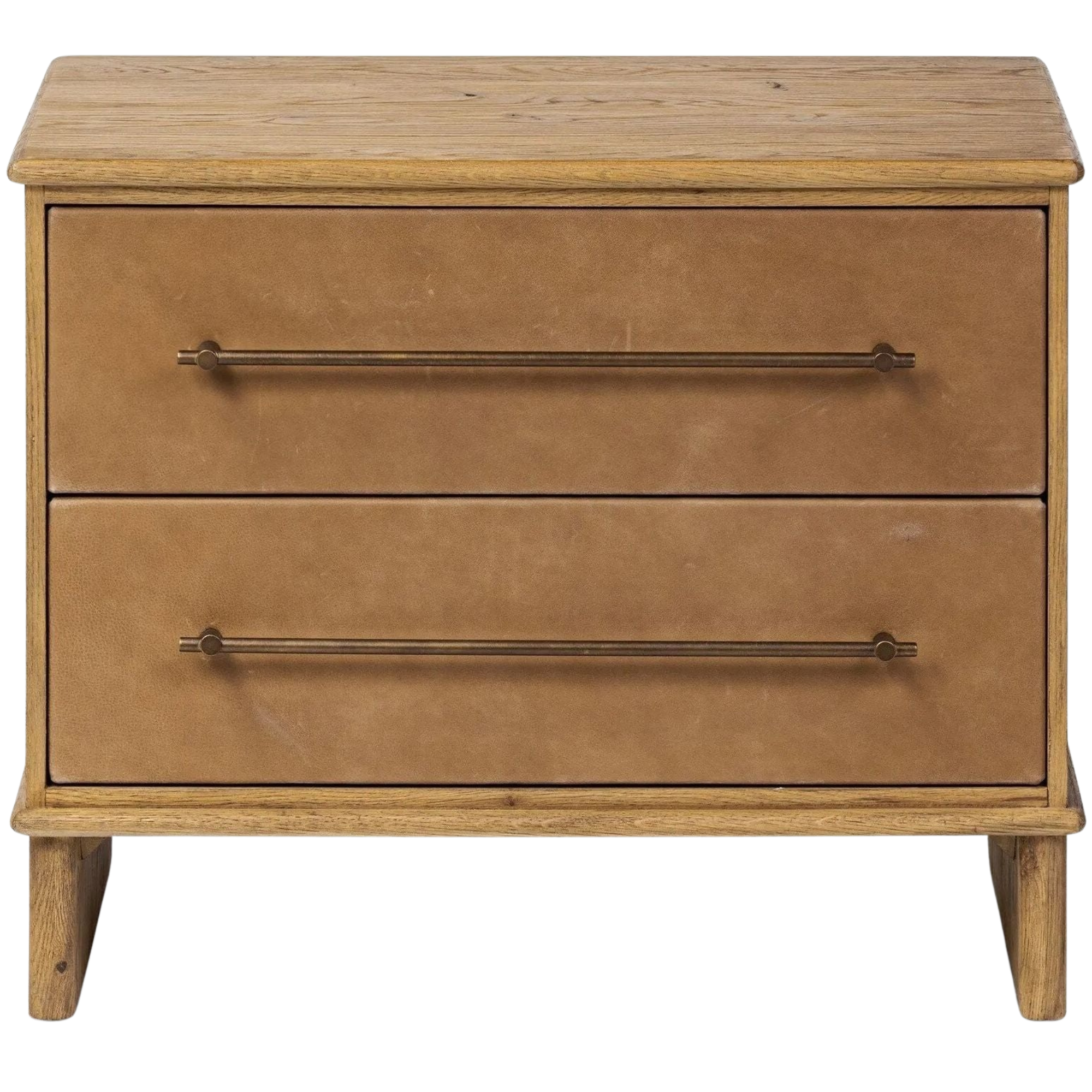 Bring a Nordic-inspired look to your bedroom styling. A spacious two-drawer nightstand of thick, grain-rich oak veneer encases drawer fronts covered with tan top-grain leather exclusive to Four Hands. Finished out with long, linear iron hardware.