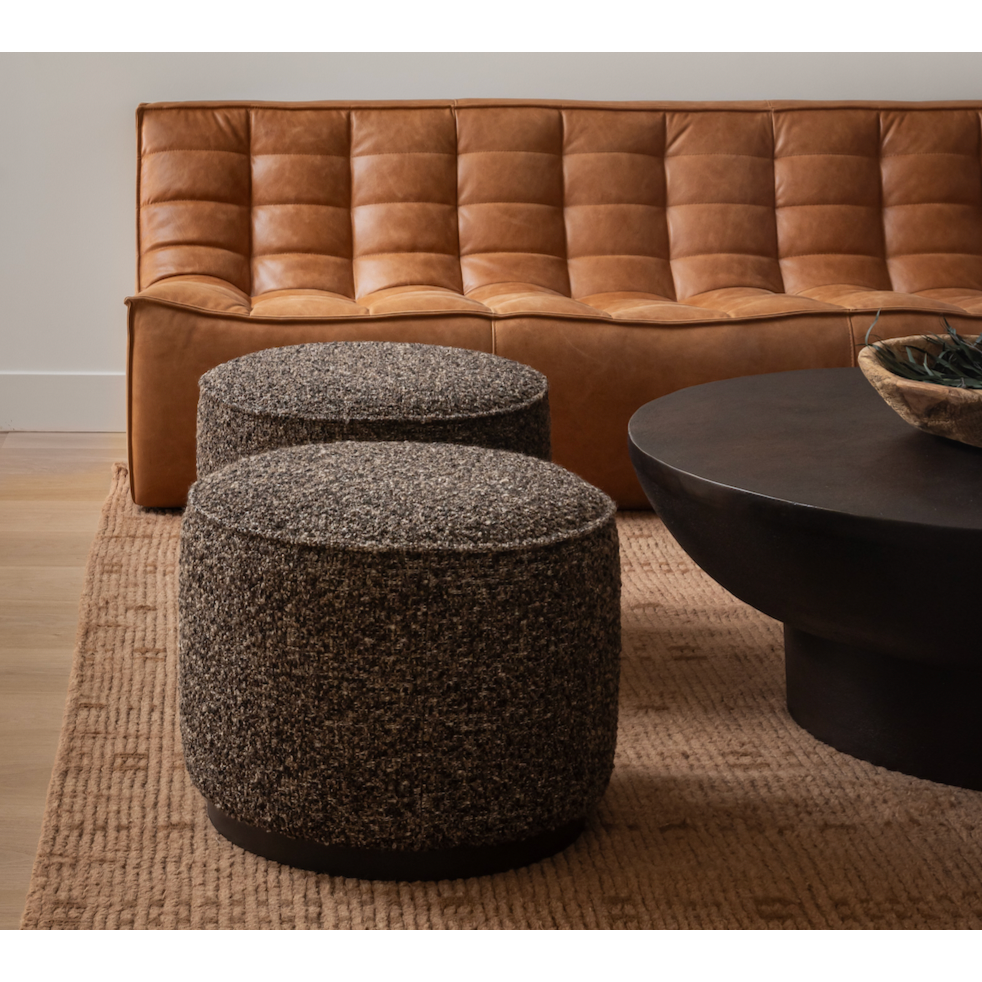This round ottoman of textural upholstery can be placed just about anywhere, bringing with it a hip retro vibe.