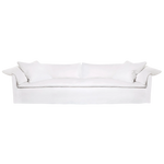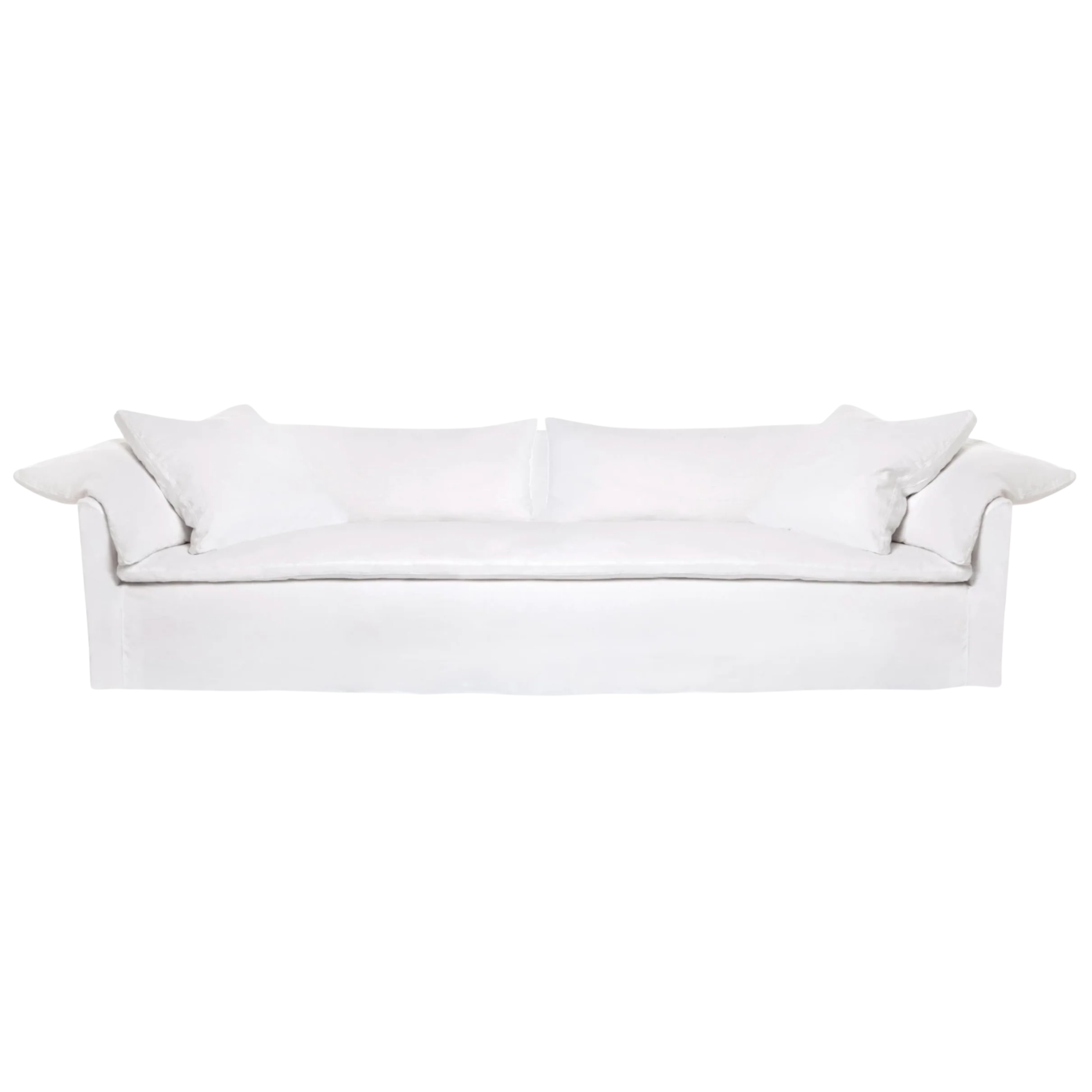 An Amethyst essential: dreamy feather top cushion covers a full upholstered frame. Slipcovered in an ethereal white linen machine washable slipcover — made just for you in North Carolina.