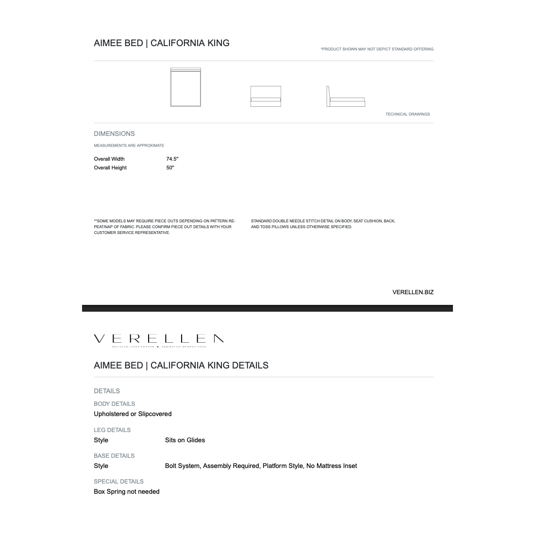 A Verellen essential, the Aimee Bed is a beautiful platform bed. Both comfy and durable, this comes standard with:  double needle stitch detail platform on glides available slipcovered not available with box spring Available in twin, full, queen, king, and California king mattresses.