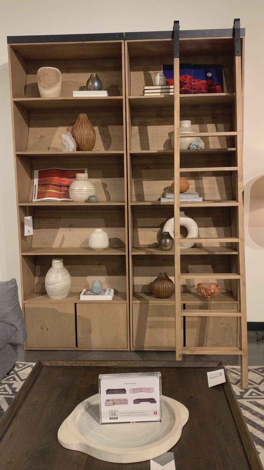Five roomy shelves are ready to store favorite books and treasures, with smoked solid pine suited for any space. Removable ledges slant at an angle on each shelf, for even-better display of art and coffee table-size books, plus an optional slide ladder (for decorative use only) to complete the look.