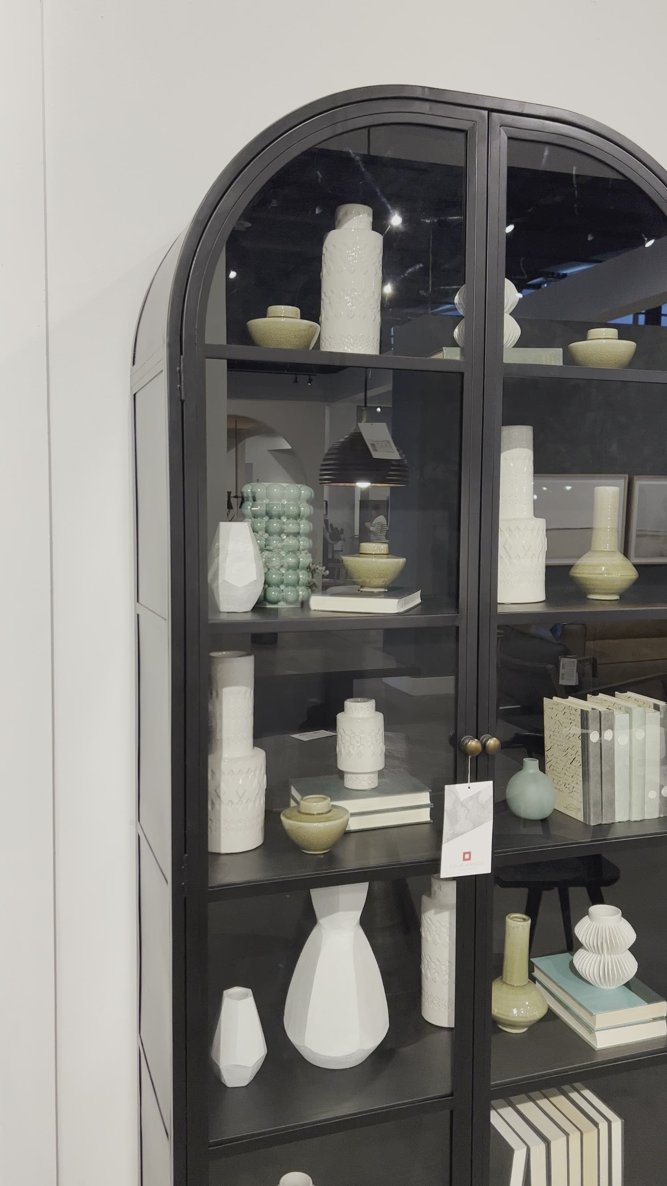 Store it in style with this Breya Cabinet - Black. Made from black-finished iron, beautifully arched cabinetry features glass-front doors, ideal for storing and displaying favorite books, photos, keepsakes, and more.  Overall Dimensions: 40.00"w x 16.25"d x 86.75"h