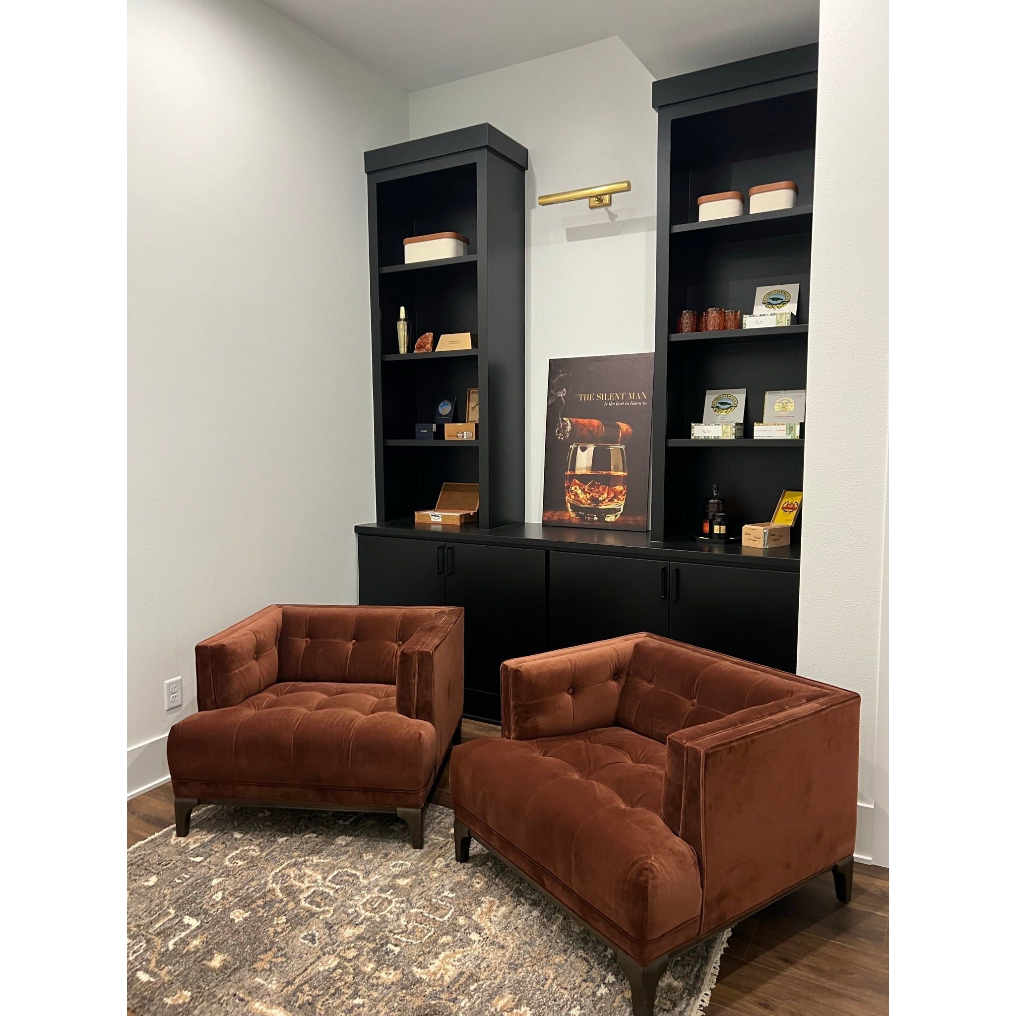This low, tailored midcentury silhouette is upholstered in a velvety auburn fabric, with dramatic blind tufting for texture.