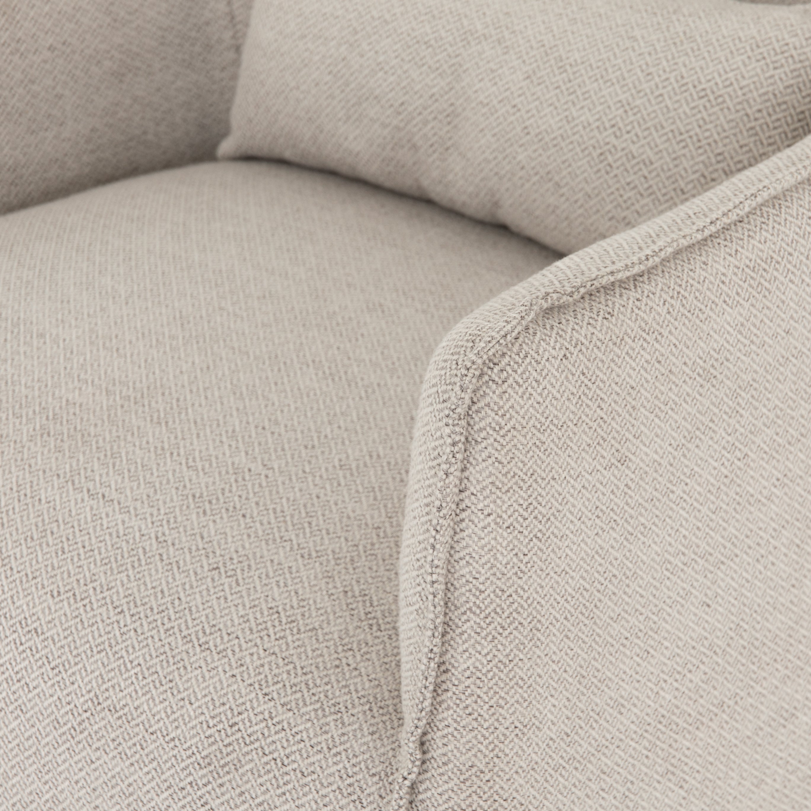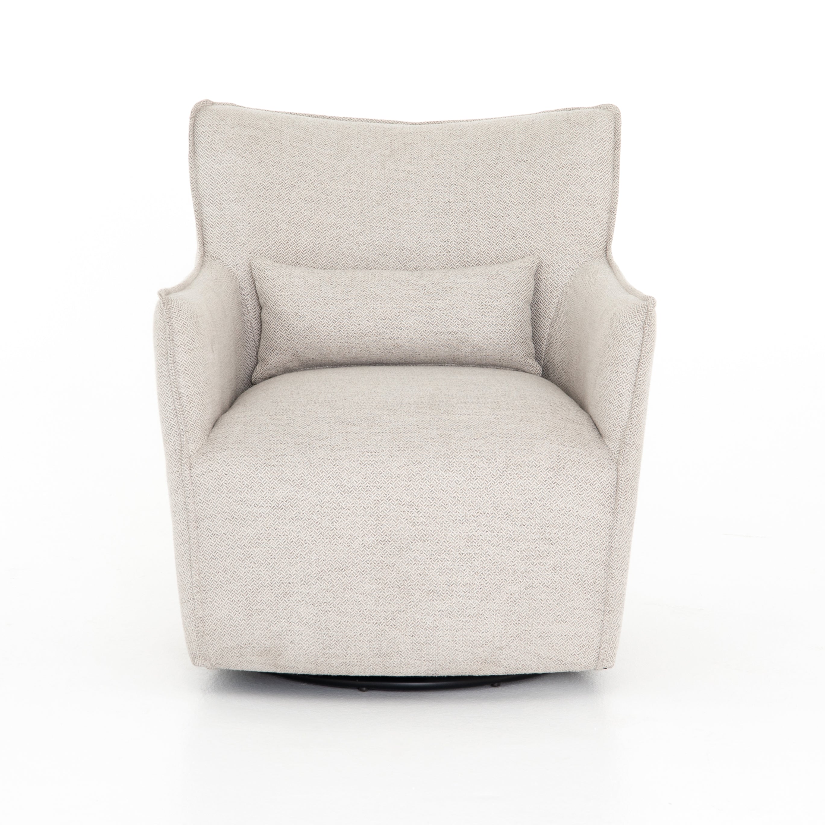 Expert tailoring on this Kimble Swivel - Noble Platinum creates a clean, sophisticated look, rich with come-hither comfort.  A tight sit and barrel shape is softened via flange seam detailing and swivel feature and finished off with a petite lumbar cushion, for the perfect mix of shape and function for any living room or baby room.