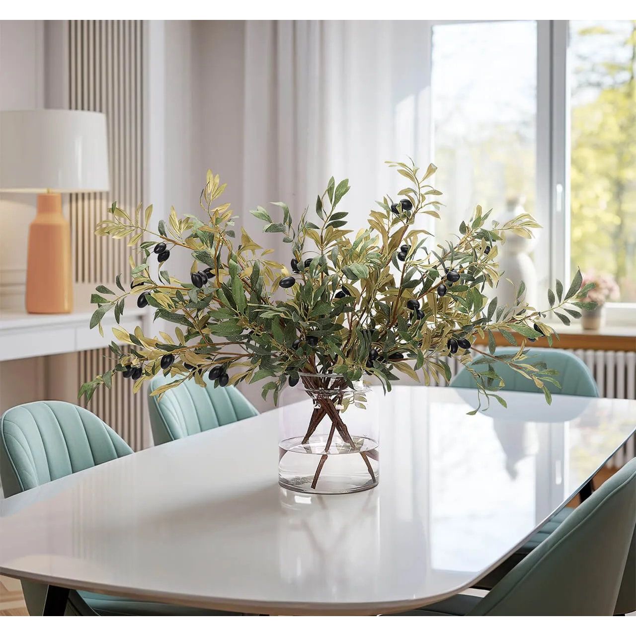 Embrace nature's charm with the green Olive Branch, thoughtfully displayed in a glass vase. With a height of 25", this arrangement offers a striking and elegant presence, blending seamlessly with seasonal or year-round decor. Enjoy its lasting beauty year-round, perfect for adding seasonal flair without any upkeep.