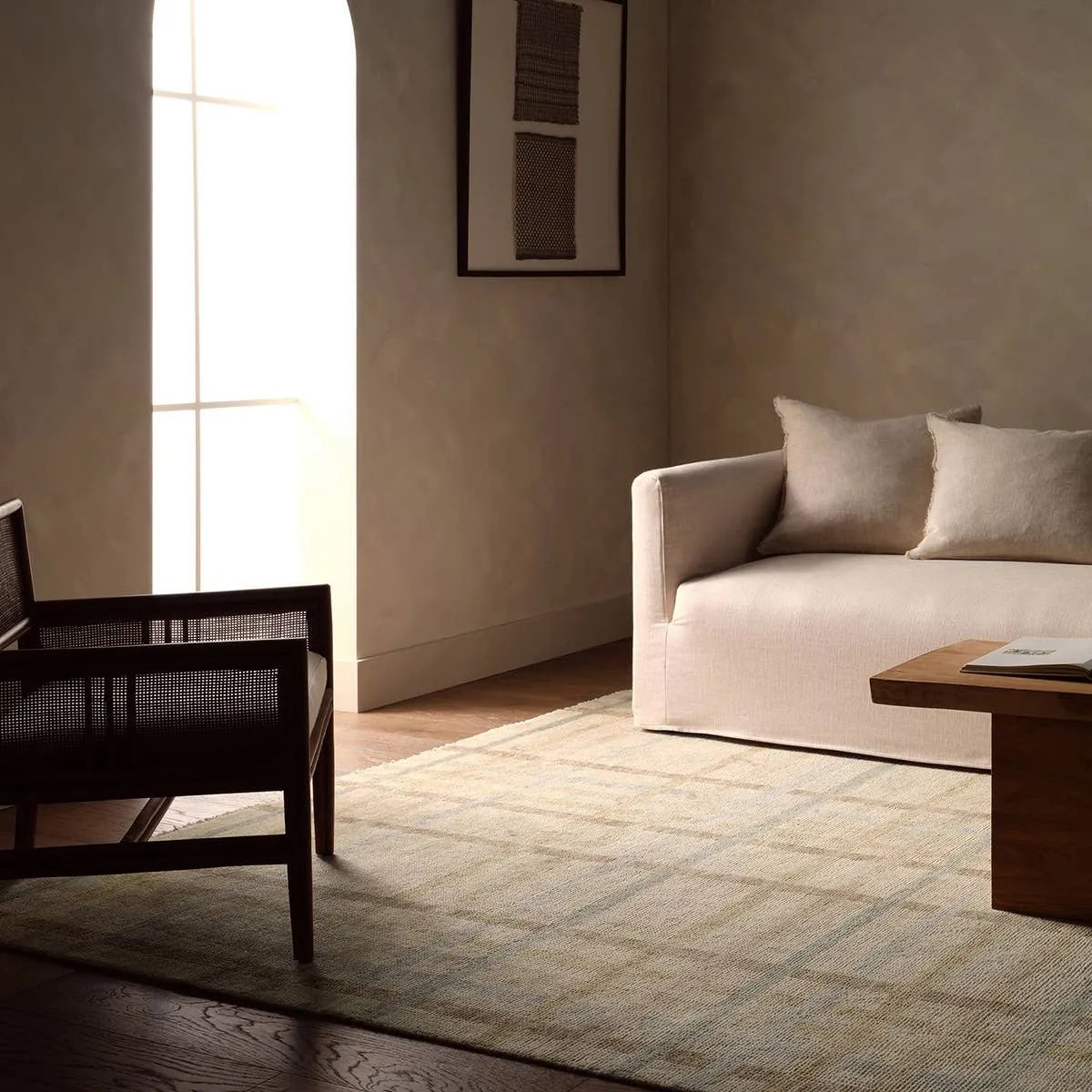 The Raza design reinvents the timeless plaid pattern, fusing classic charm with a modern edge. Soft beige tones, punctuated by a blue accent, elevate any mid-century modern space. Handcrafted from naturally stain-resistant wool, this rug handles medium-traffic areas, kids, and pets with ease. A durable yet stylish foundation, this piece is designed to stand the test of time.