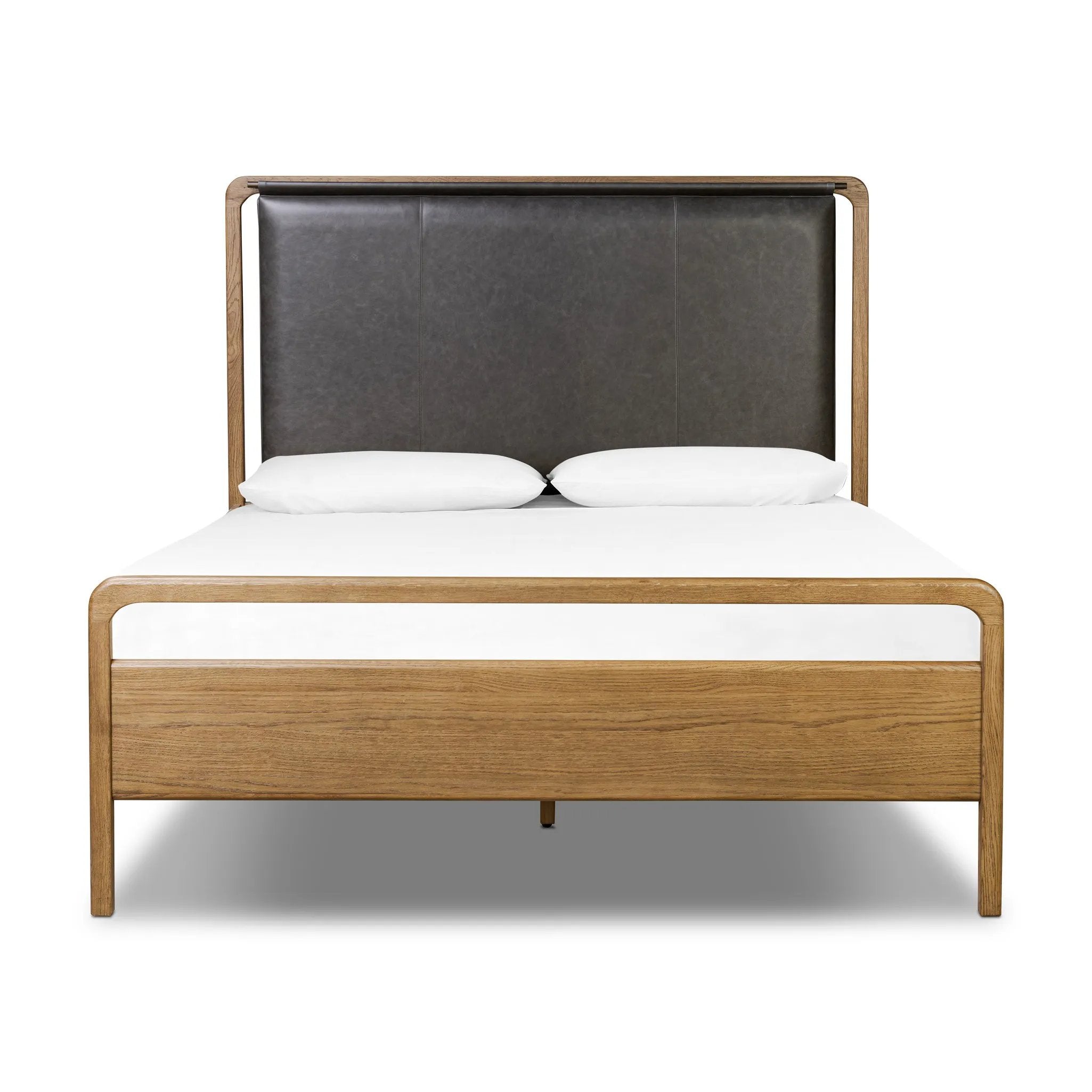 Amber-finished solid oak frames a floating, sling-style headboard made from black top-grain leather, with subtly rounded edges and metal dowel detailing Amethyst Home provides interior design, new home construction design consulting, vintage area rugs, and lighting in the Los Angeles metro area.