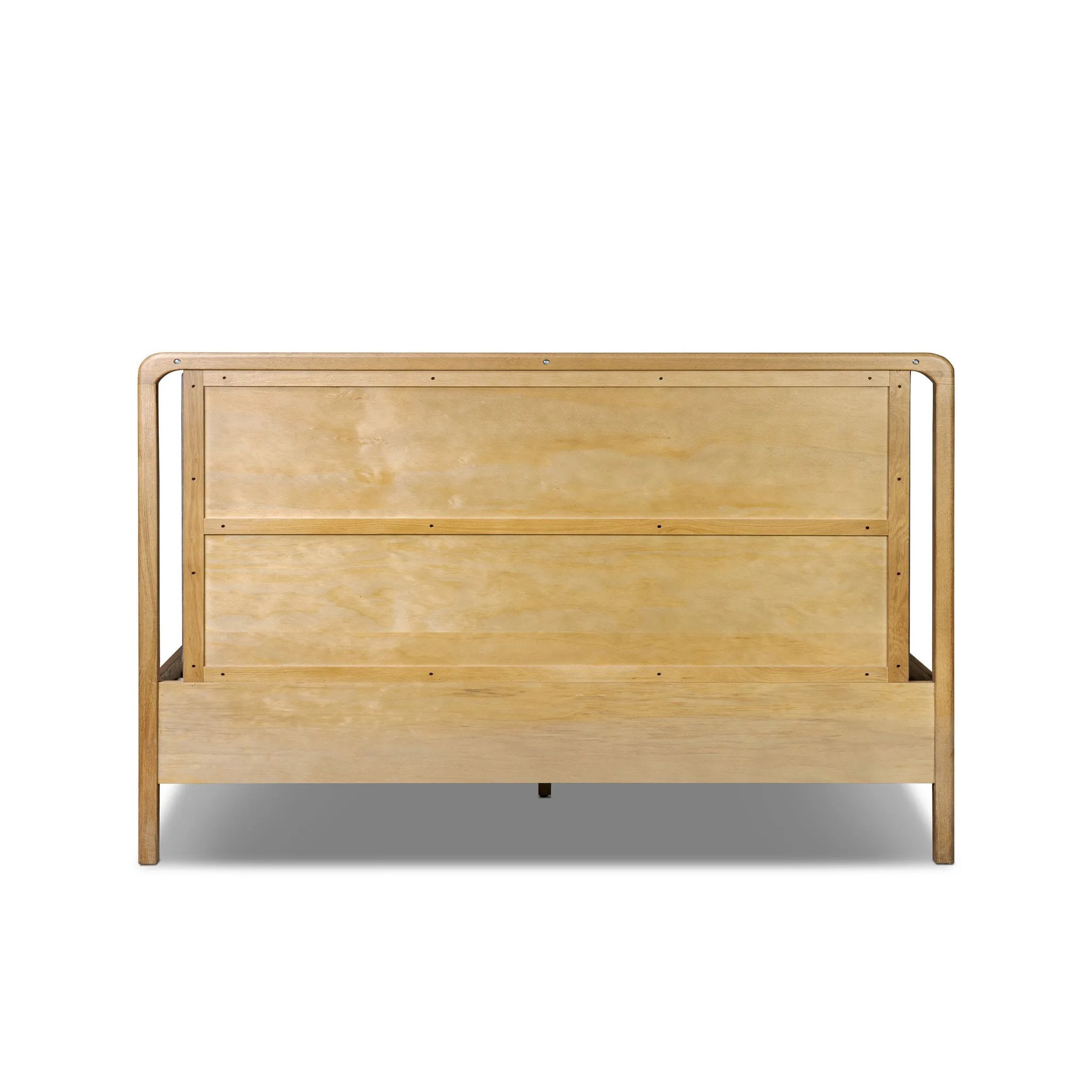 Amber-finished solid oak frames a floating, sling-style headboard made from black top-grain leather, with subtly rounded edges and metal dowel detailing Amethyst Home provides interior design, new home construction design consulting, vintage area rugs, and lighting in the Monterey metro area.