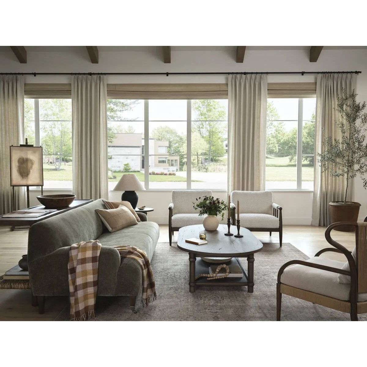 A classic silhouette through a contemporary lens. Framed in vintage oak, this accent chair features tapered legs, spindles along the arms and bauble details. Finished in Turkish-made upholstery with a heavy pile that blends brushed, pulled and boucle styles, it's woven into a subtle linear pattern for intriguing depth.
