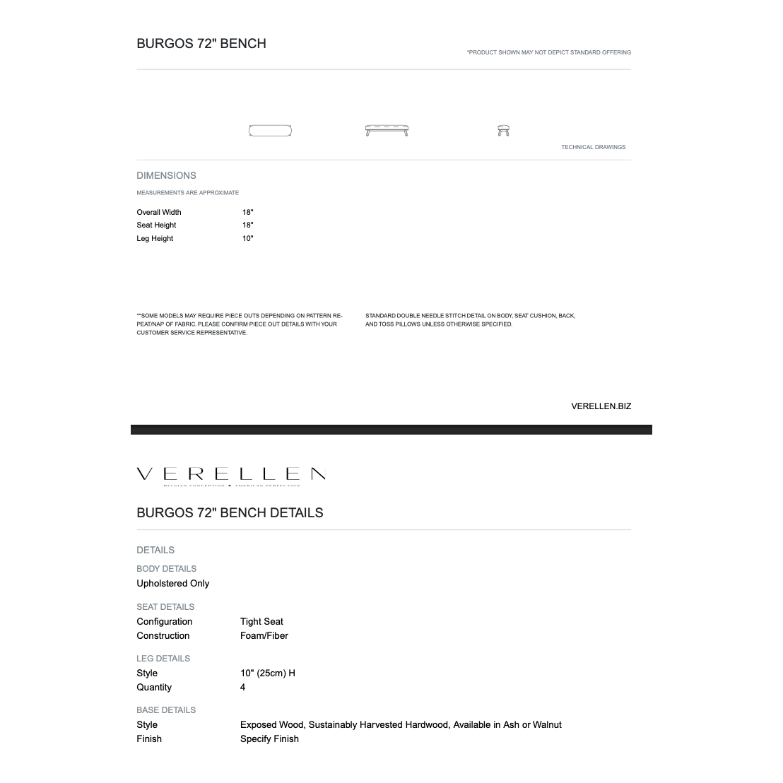 Introducing the Burgos Bench, featuring elegantly shaped legs, clean lines and a plush upholstered top.