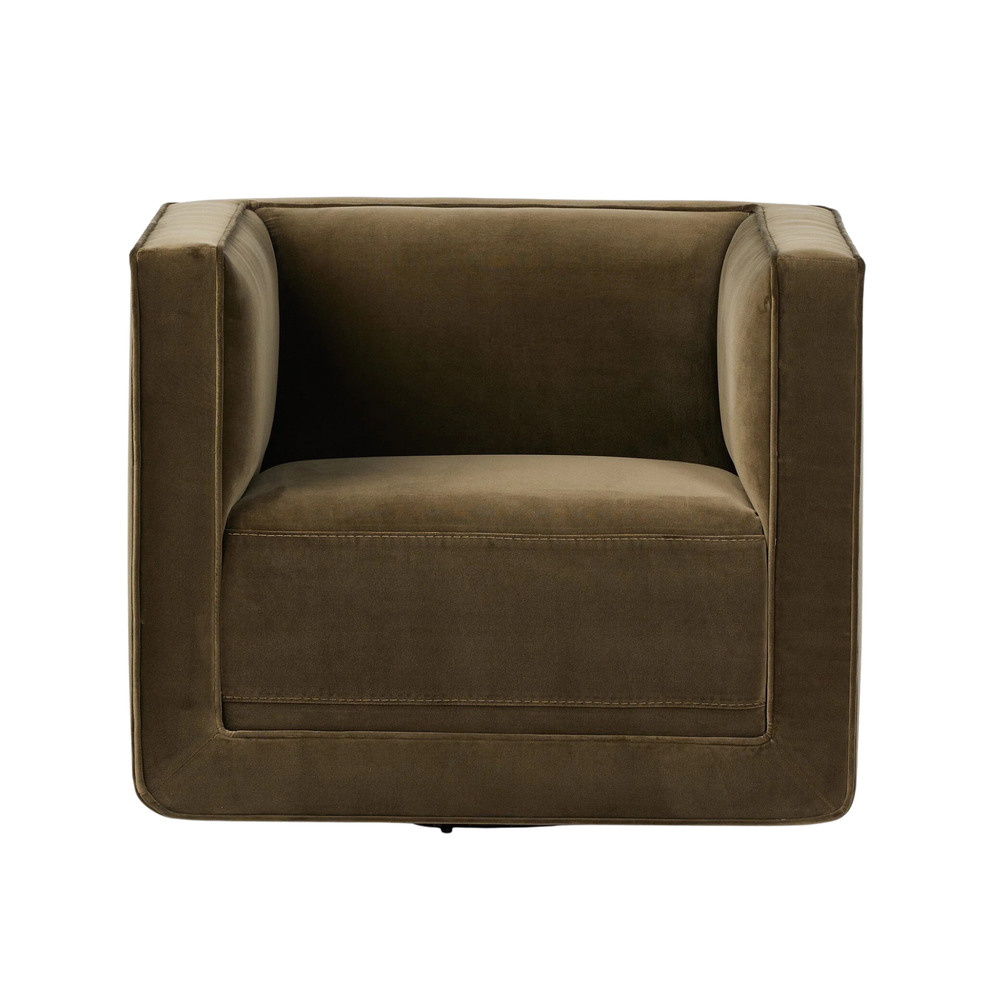 Style meets substance in this olive cotton-blend swivel chair. Blind stitching along the seat and back cushions create a polished complement to the heritage frame. The slight pronounced seat cushion creates an illusion of being loose, but is actually a fixed cushion with expert tailoring. A piping channel detail gives the arm a finished look.