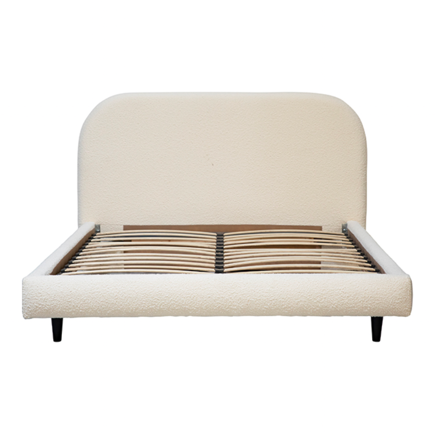 Featuring Marlene Bed by Dovetail at Amethyst Home. We love the rounded edges of this Marlene Bed. The off white boucle brings a textured, warm look to any bedroom.