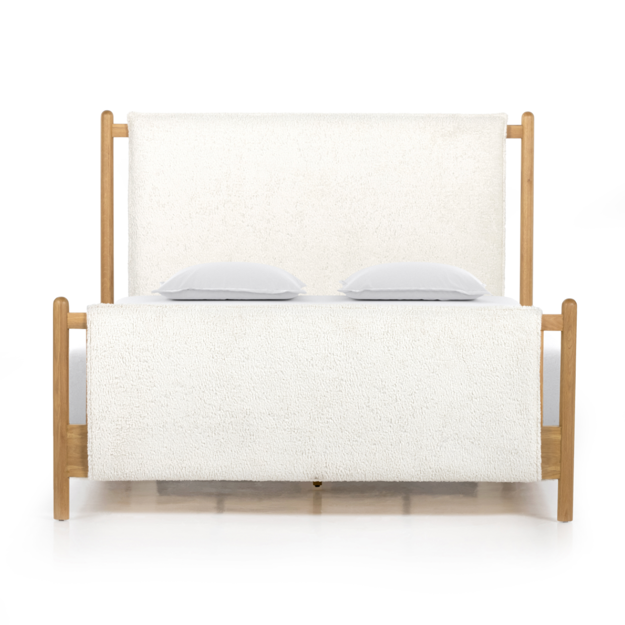Featuring Bowen Bed by Four Hands at Amethyst Home. Bring a cozy hygge vibe to the bedroom with this textured Bowen Bed. Framed by light-finished solid oak, a sling-style bed features faux shearling head and foot boards -- sure to elevate any bedroom.