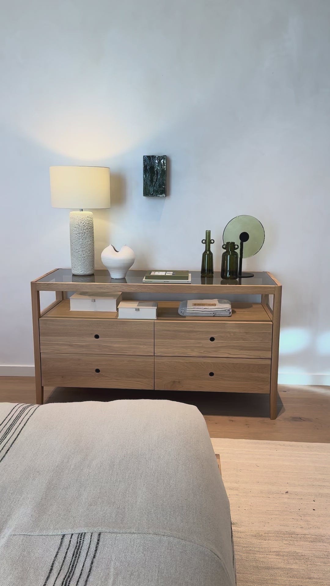 Featuring Spindle Dresser Oak by Ethnicraft at Amethyst Home. The Spindle collection found its inspiration in the traditional spinning wheel. Slightly tapered legs and rounded edges add a soft, sensual quality to this beautiful bedroom collection. This dresser is just as much at home in the bedroom as it is in commercial spaces as a stylish storage solution. Amethyst Home provides interior design, new home construction design consulting, vintage area rugs, and lighting in the San Diego metro area.