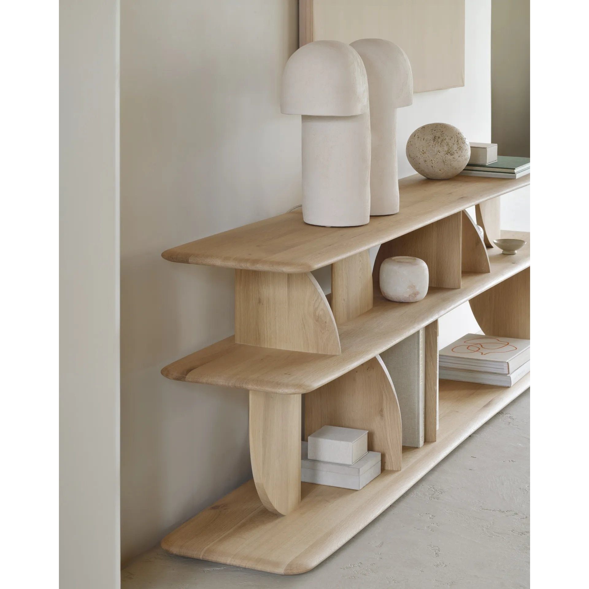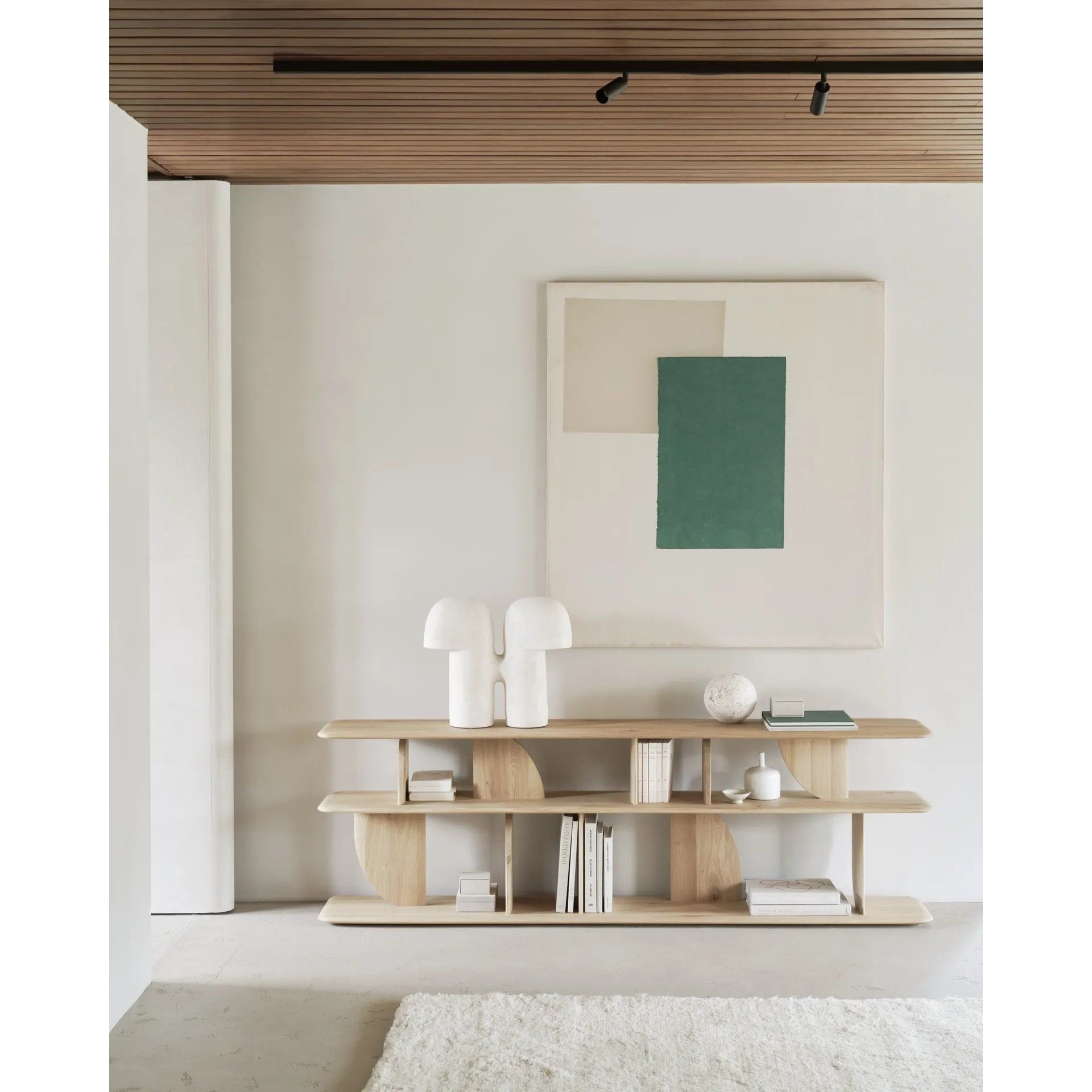 Featuring Geometric Oak Sofa Console by Ethnicraft at Amethyst Home. In the Geometric collection, shapes intersect in unexpected ways, creating playful contrasts with light and shadow at every angle. The Geometric console offers an eye-catching addition to an entry or hallway.
