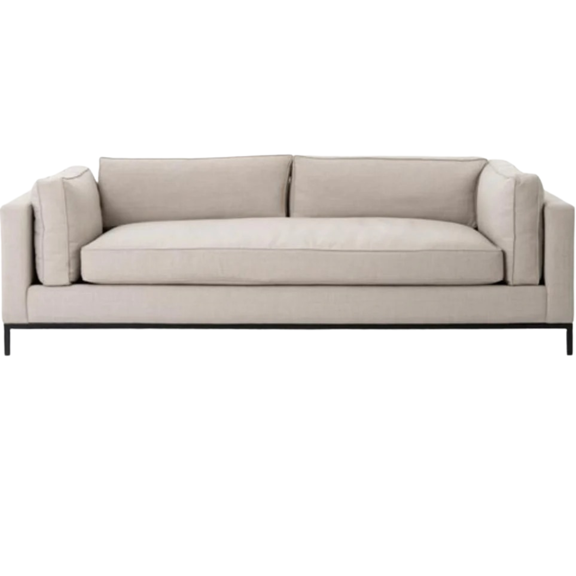 Streamlined yet comfortable!  We loved the subtle piping of the cushion details and beautiful neutral color!  Flexible style, luxurious comfort and family-friendly upholstery. Clean, simple lines and black iron base keep everything casual and chic.