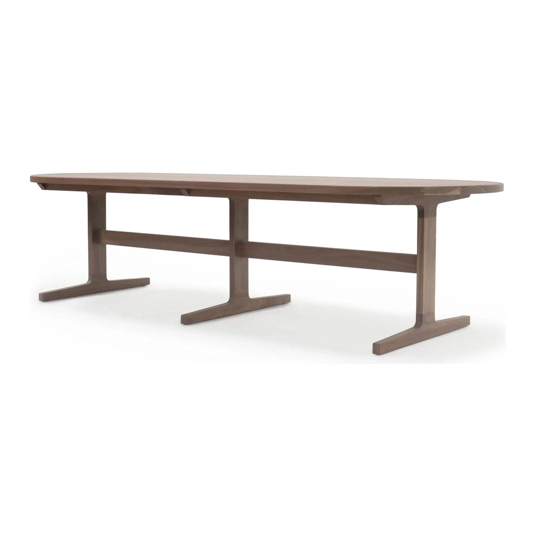 A Verellen classic: the I Beam Dining Table is our take on a classic trestle table. It's handmade from sustainably harvested hardwood featuring an oval table top with unique step detail and trestle style legs. Available in Ash or Walnut. Amethyst Home provides interior design, new home construction design consulting, vintage area rugs, and lighting in the Laguna Beach metro area.