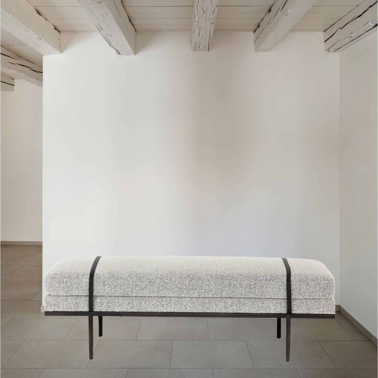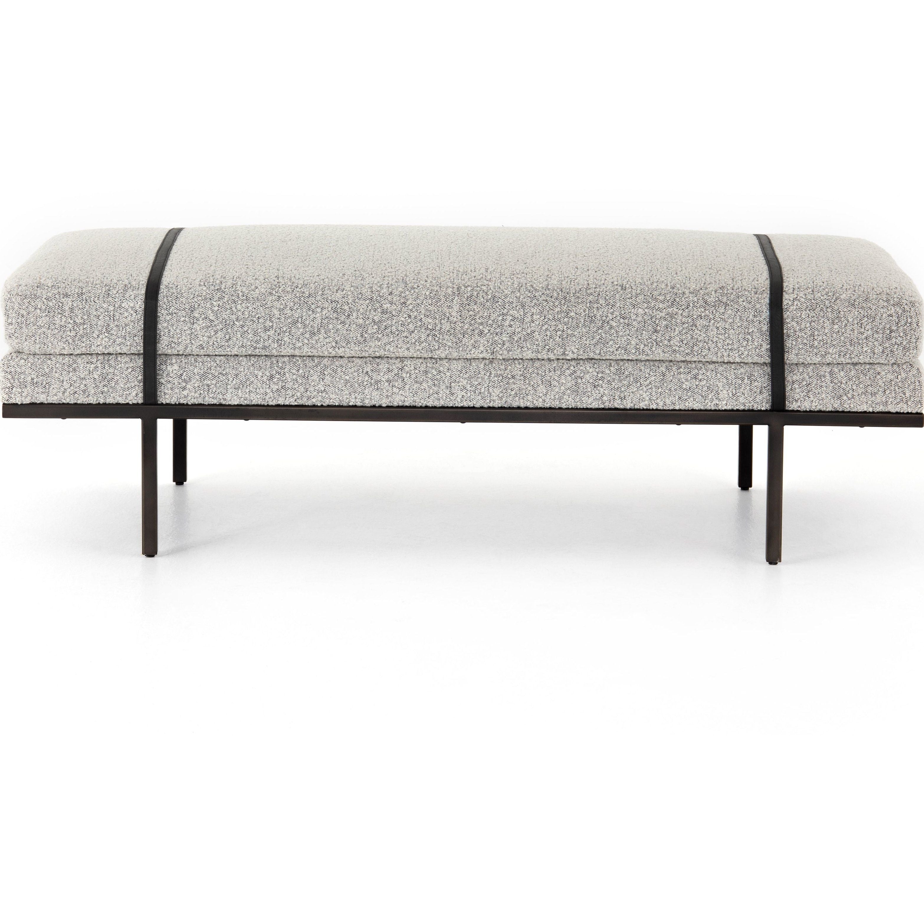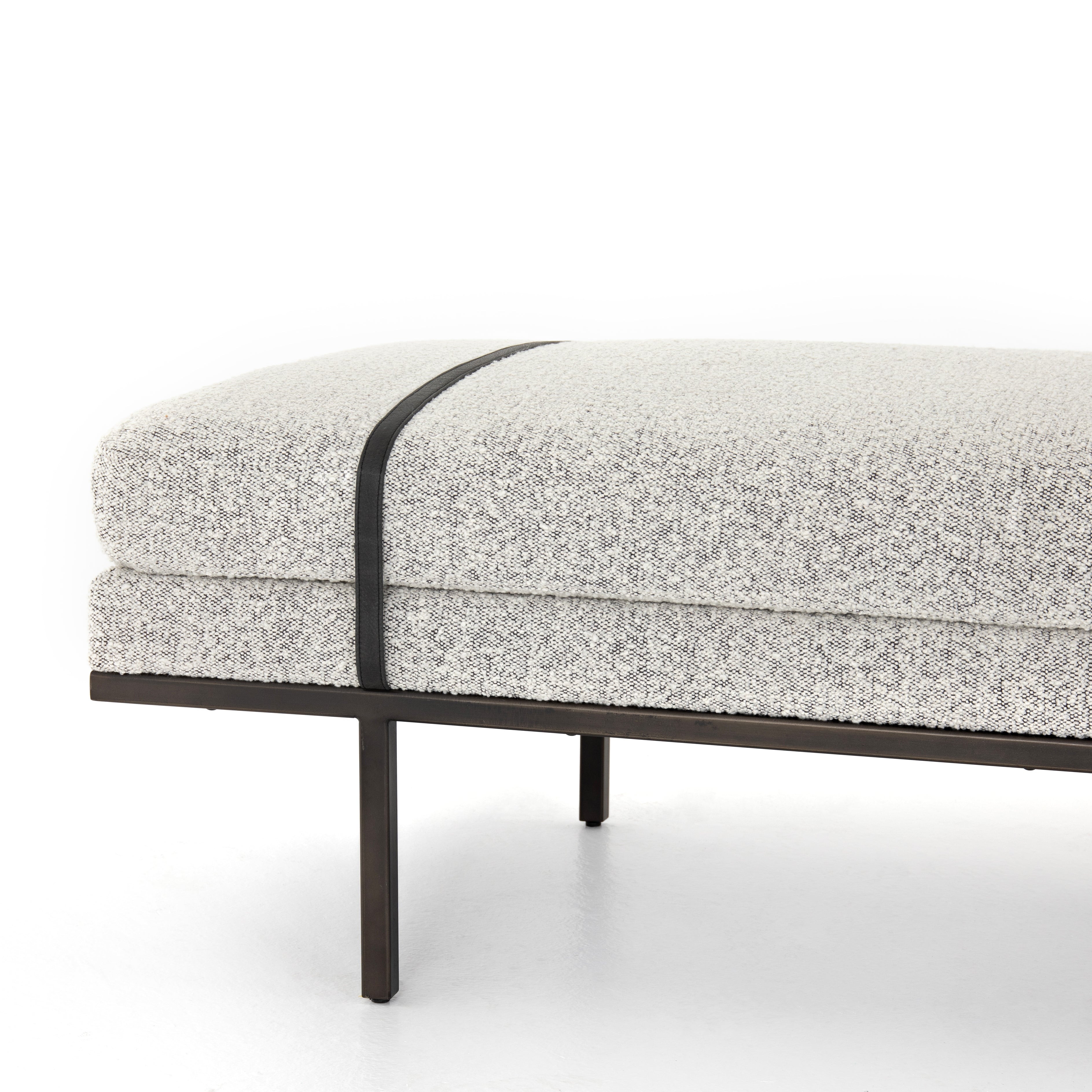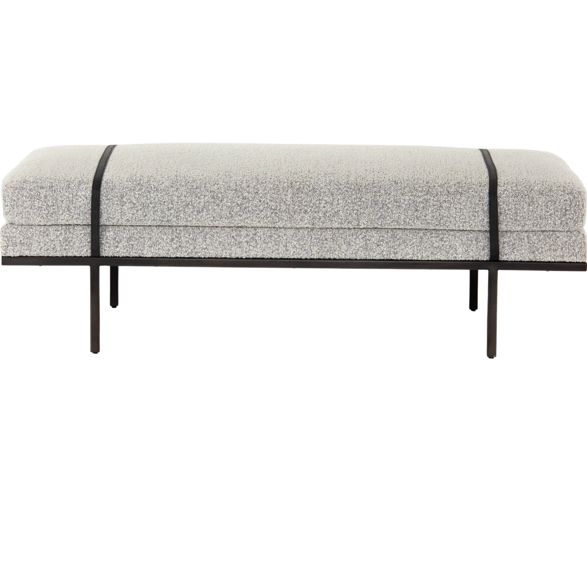 Featuring Harris Knoll Domino Accent Bench by Four Hands at Amethyst Home. Make a chic statement with the Harris Knoll Domino Accent Bench. Decorative straps of black top-grain leather take chaise-style bench seating to the next level. Airy, elongated legs lend a look of lightness for balance.