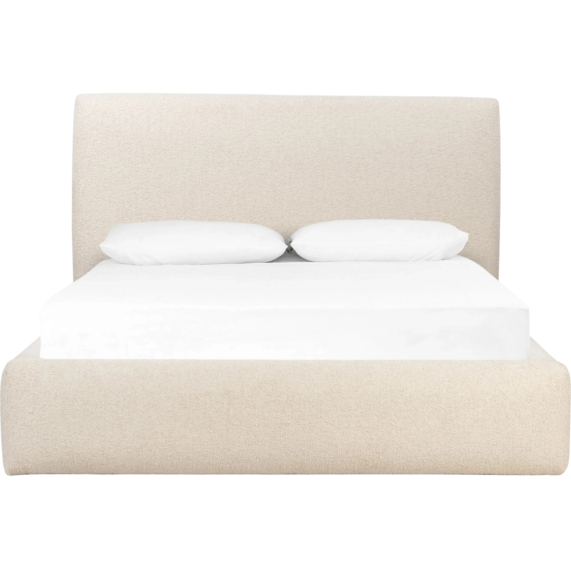 Featuring Quincy Lisbon Cream-King Bed by Four Hands at Amethyst Home. Modern, clean shaping meets inflated comfort with this padded, upholstered bed frame in a textural boucle-like pattern.  Text (251) 257-7986 for quick product details.Overall Dimensions: 92.25"W x 89.25"L x 48"H