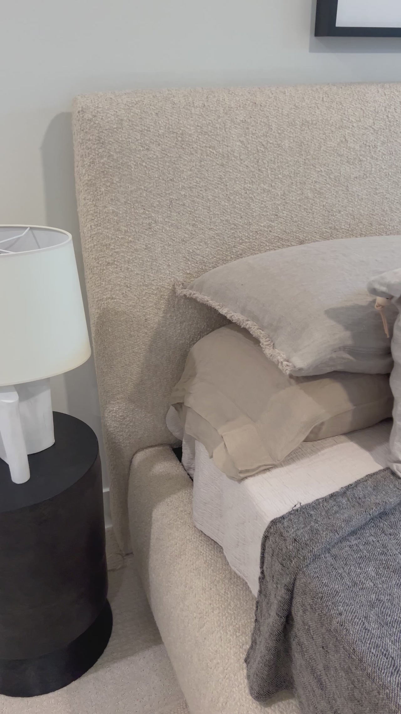 Une forme moderne et épurée rencontre un confort gonflé avec ce cadre de lit rembourré et tapissé dans un motif texturé semblable à une boucle.