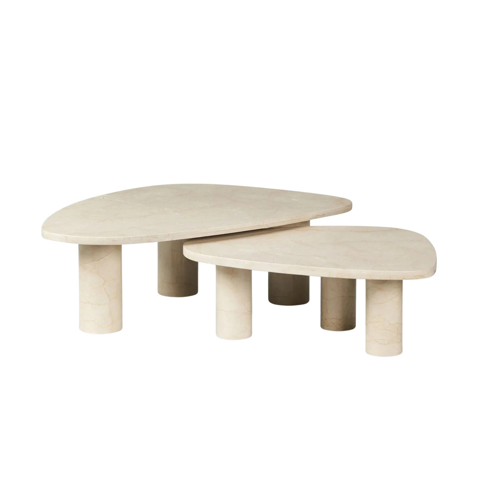 Made from solid marble with visible natural veining, turned pillar-style legs complement organically shaped tabletops, perfectly sized for nesting. Option to buy tables individually or together as a two-piece set.