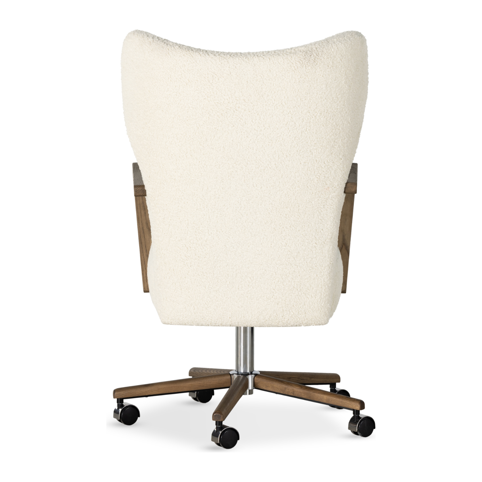 Featuring Melrose Sheepskin Natural Desk Chair by Four Hands at Amethyst Home. A comfort-driven desk chair features soft, textural upholstery, framed by solid ash arms. A height-adjustable swivel base with casters makes for ease in the modern office.Overall Dimensions: 24.50"W x 27.25"L x 40"HColors: Amber Ash, Polished Aluminum, Sheepskin NaturalMaterials: So. Amethyst Home provides interior design, new home construction design consulting, vintage area rugs, and lighting in the Malibu metro area.