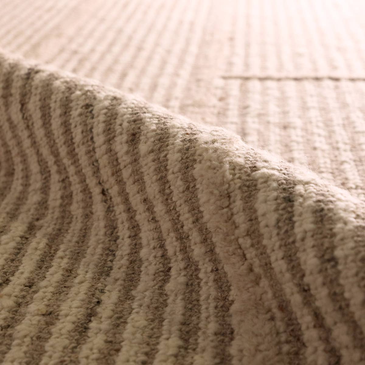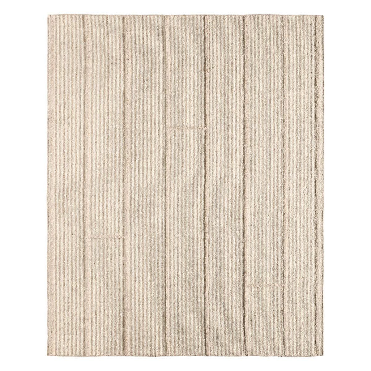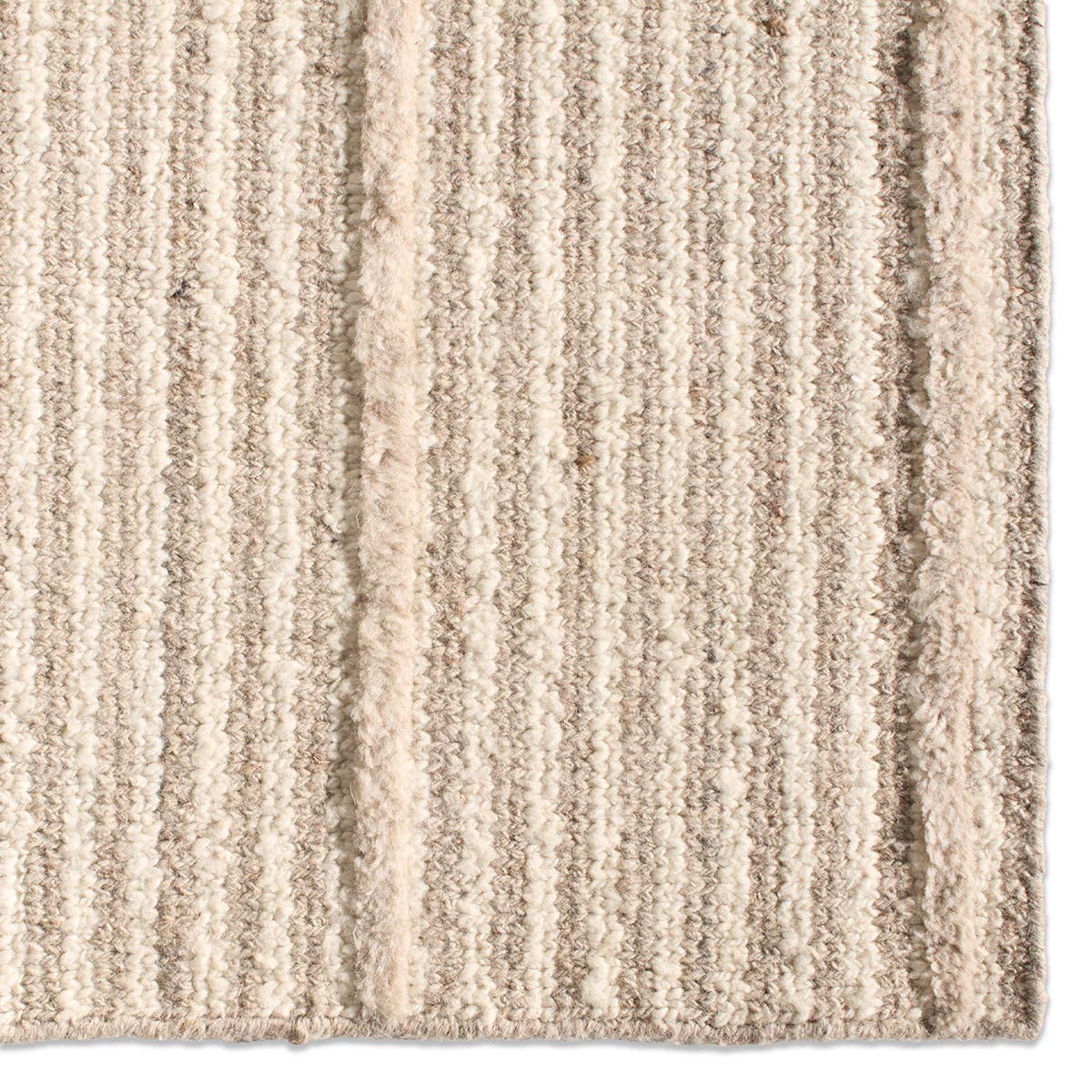 Earthy white and beige tones come together in a grounding linear design, infusing the Verena rug with contemporary elegance. Handwoven from a luxe wool pile, its luminous sheen highlights every intricate detail.