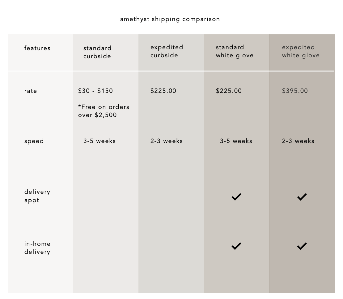 Meubles, œuvres d'art, éclairage - Disponibles pour la livraison de fret au Canada et aux États-Unis. Pour les clients d’Europe et d’Australie, nous proposons un tarif par pièce de 750 USD pour livrer avec une commande minimum de 3 000 USD. Veuillez contacter notre équipe à design@amethysthome.com pour une facture personnalisée.