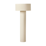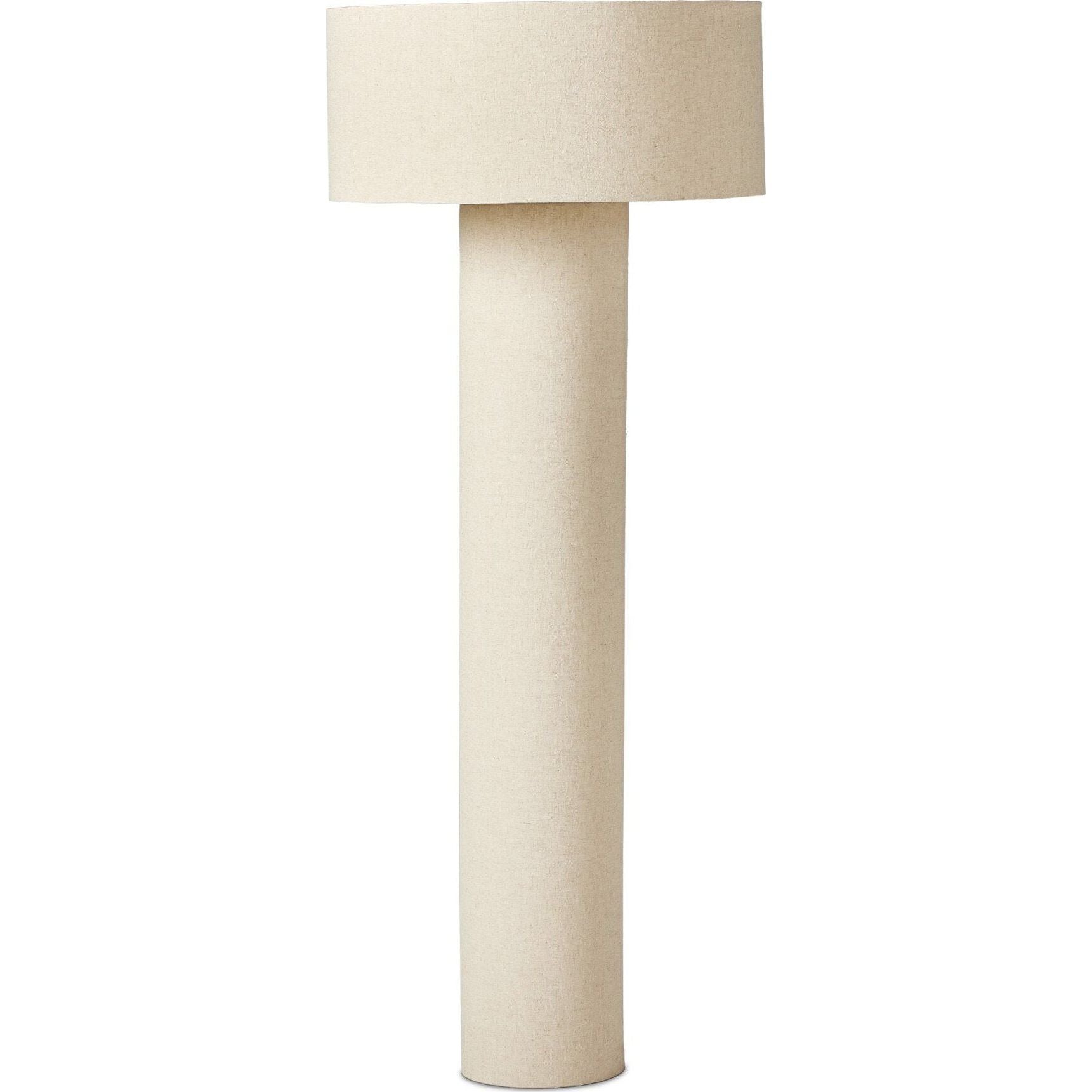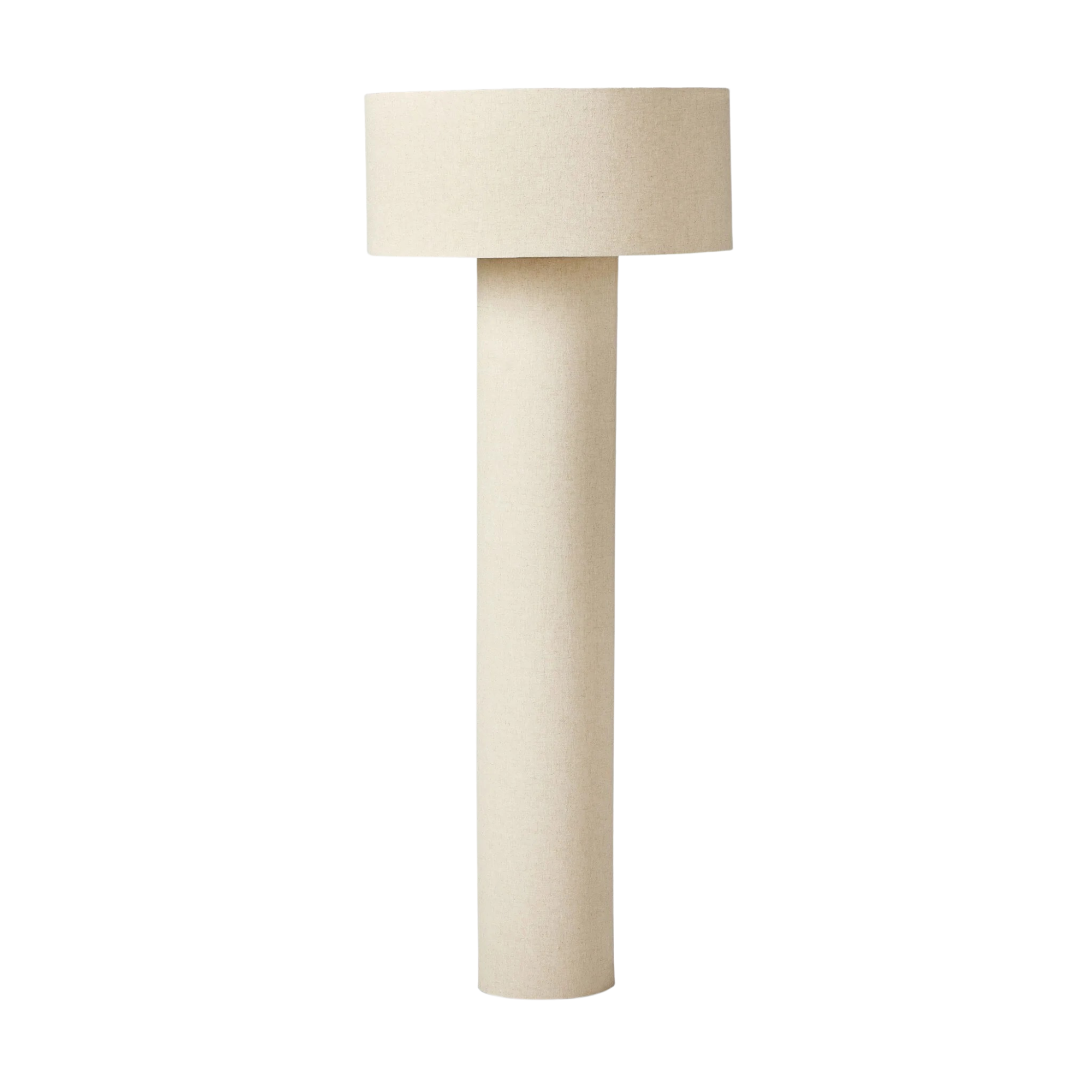 Monochrome material. Flax linen covers a classic cylindrical base, topped with a round, low drum-style shade — a modern shape and play on proportions. Brass rotary and finial detail on top break up the all-linen look.