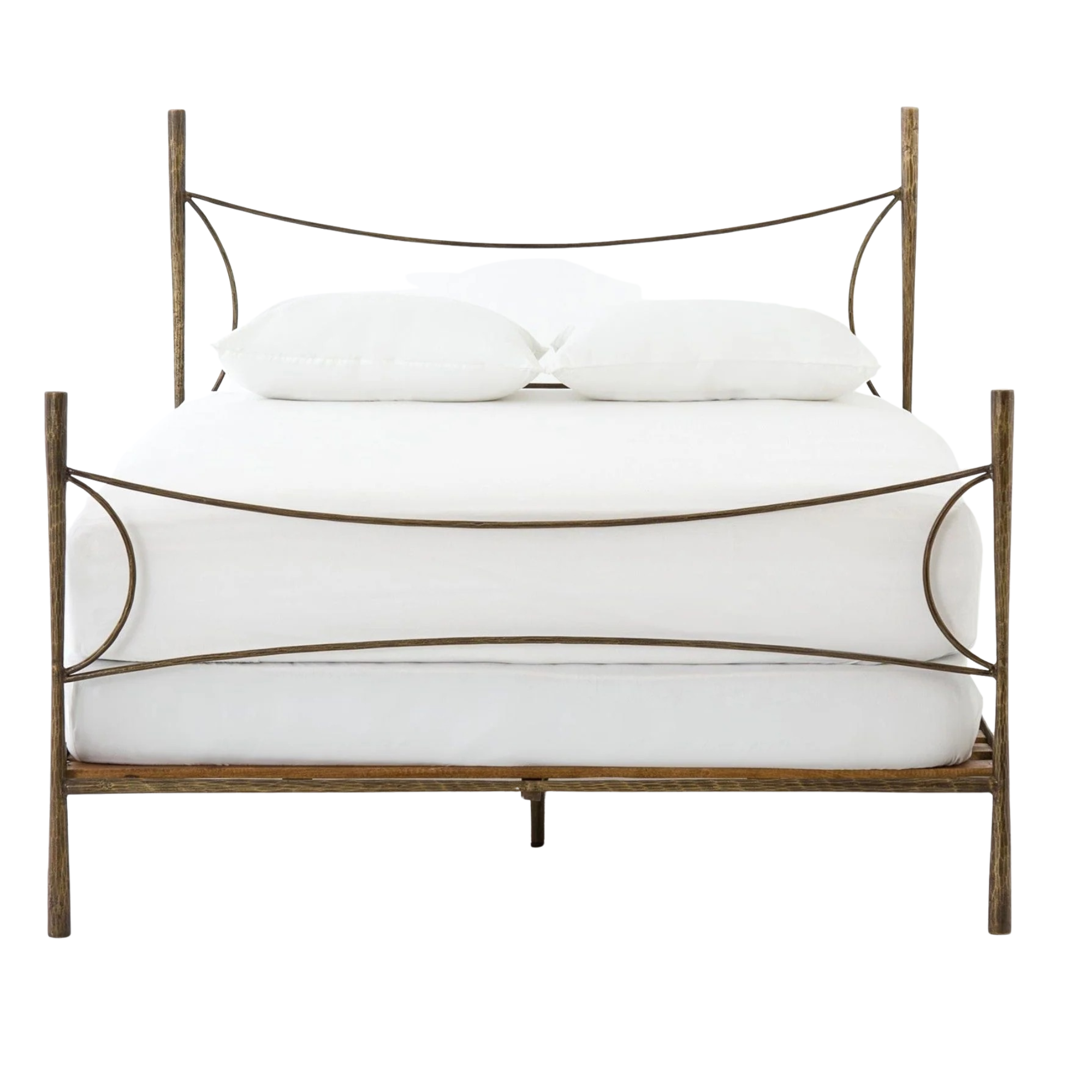 Featuring Westwood Bed by Four Hands at Amethyst Home. Beguiling curves soften hard materials for marked drama with this Westwood Bed. Slim, hammered iron is finished in antique brass for depth that defies this frame's feminine air. Low-profile box spring recommended.