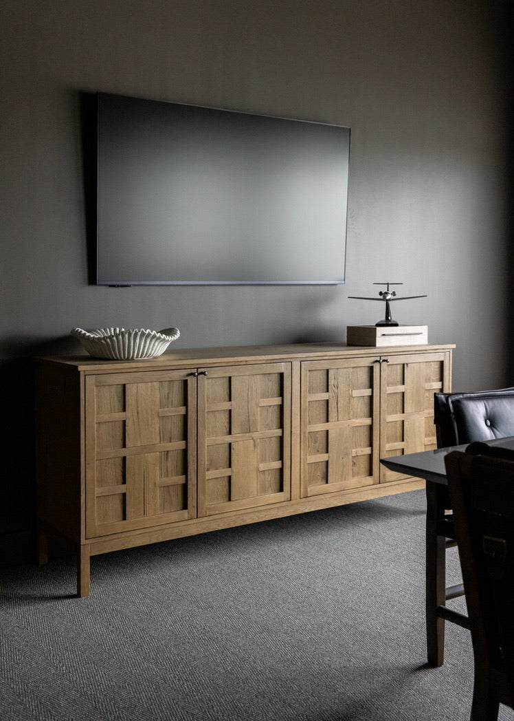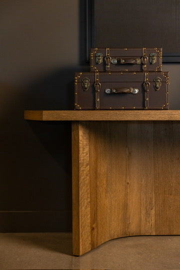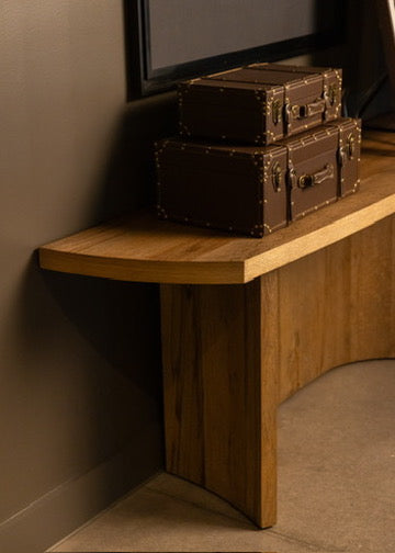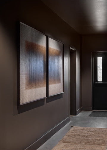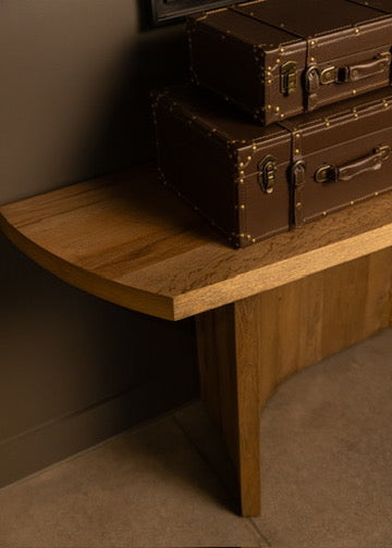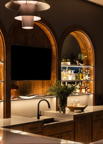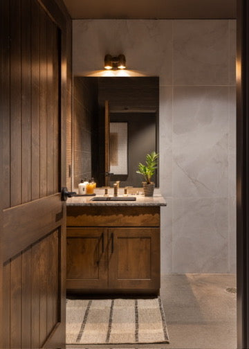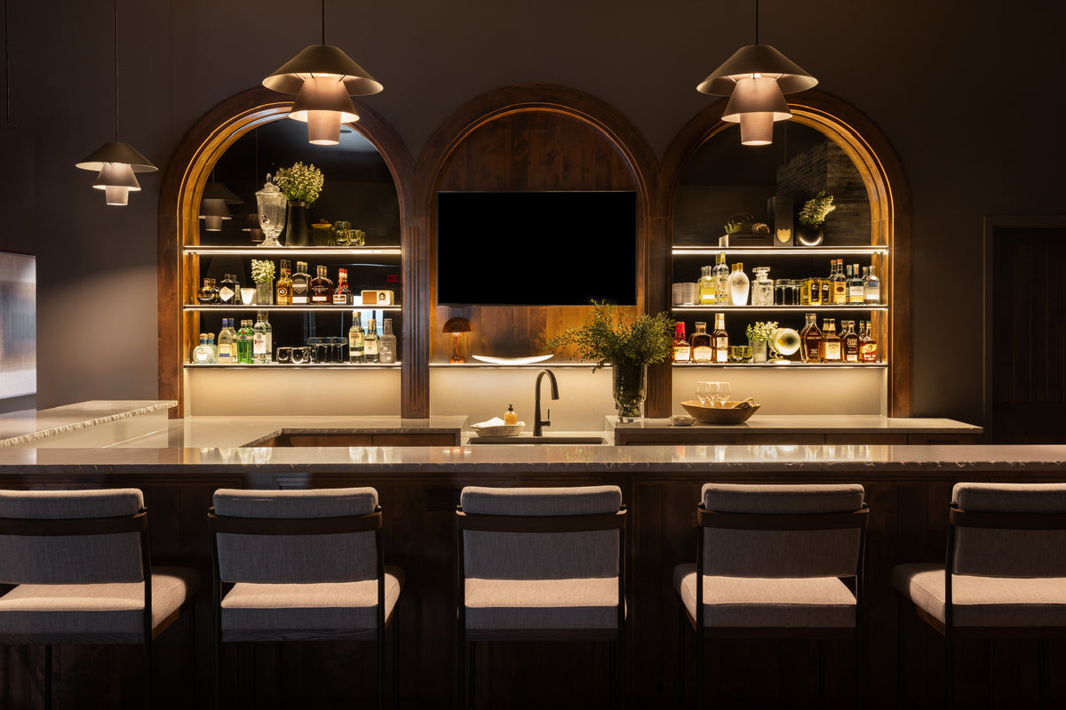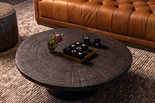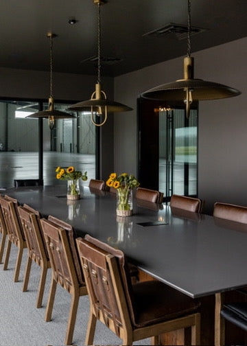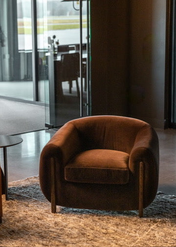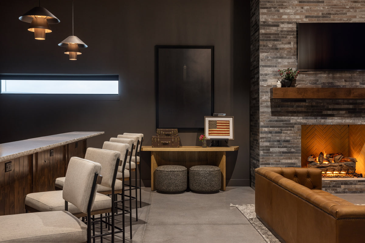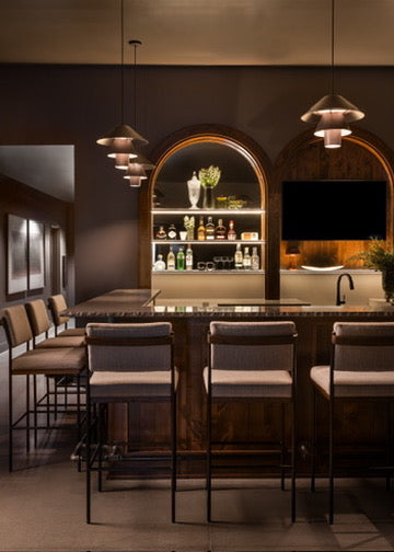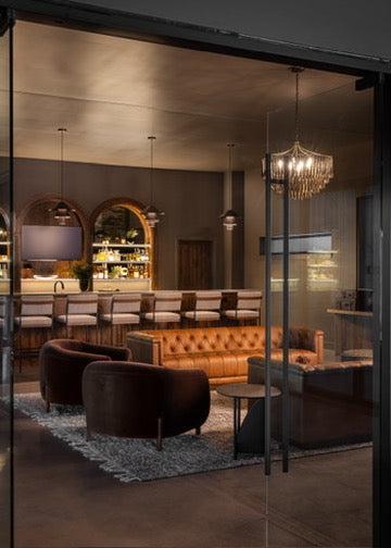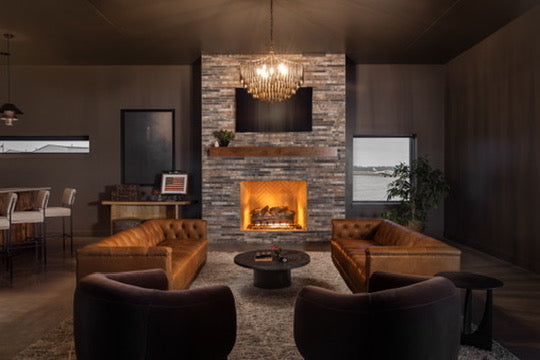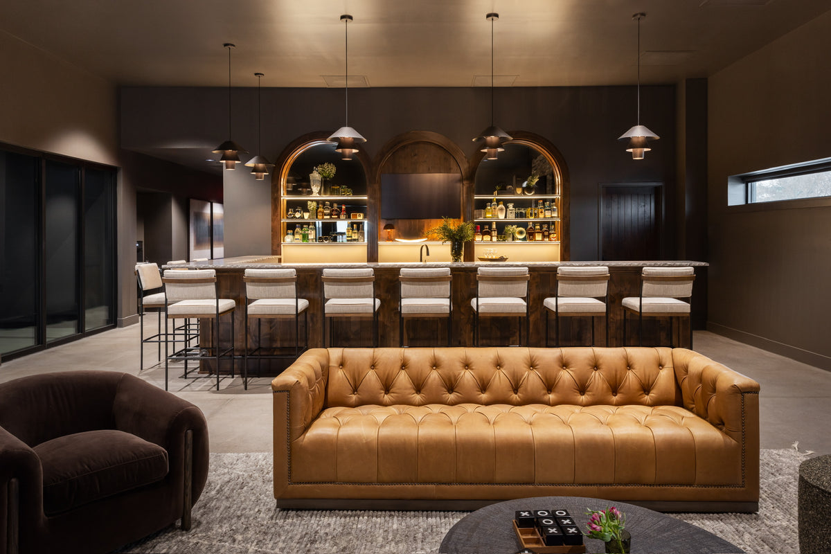Moody, industrial with warm velvets, carved iron, and wood details.