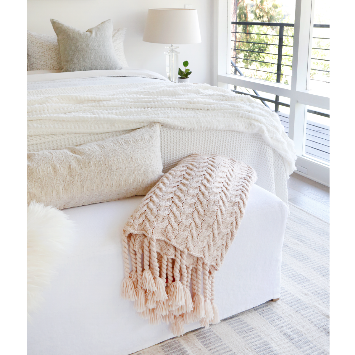 This Capistrano Throw - Three Colors is a soft cable knit throw featuring Pom Pom at Home's popular long twisted tassels along the edge. Available in 3 gentle colors.