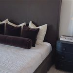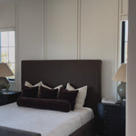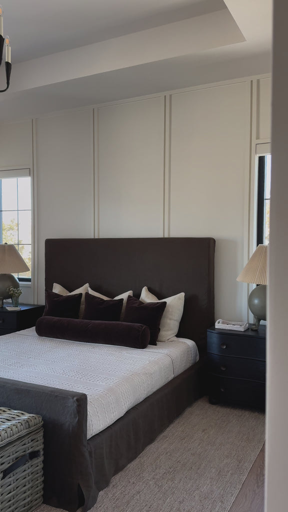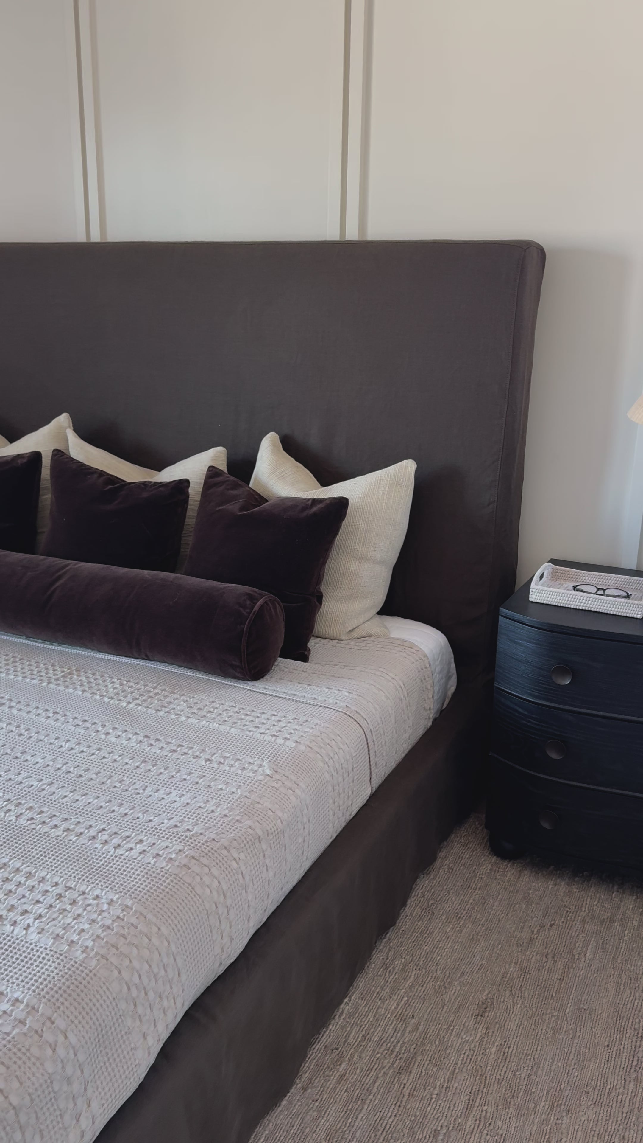 Grand high back and matte linen beauty -- the Daphne bed is a dream!