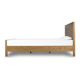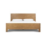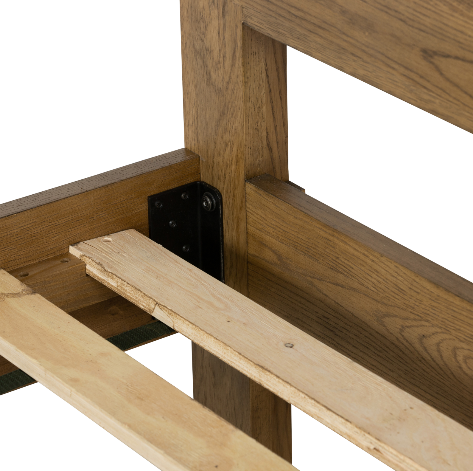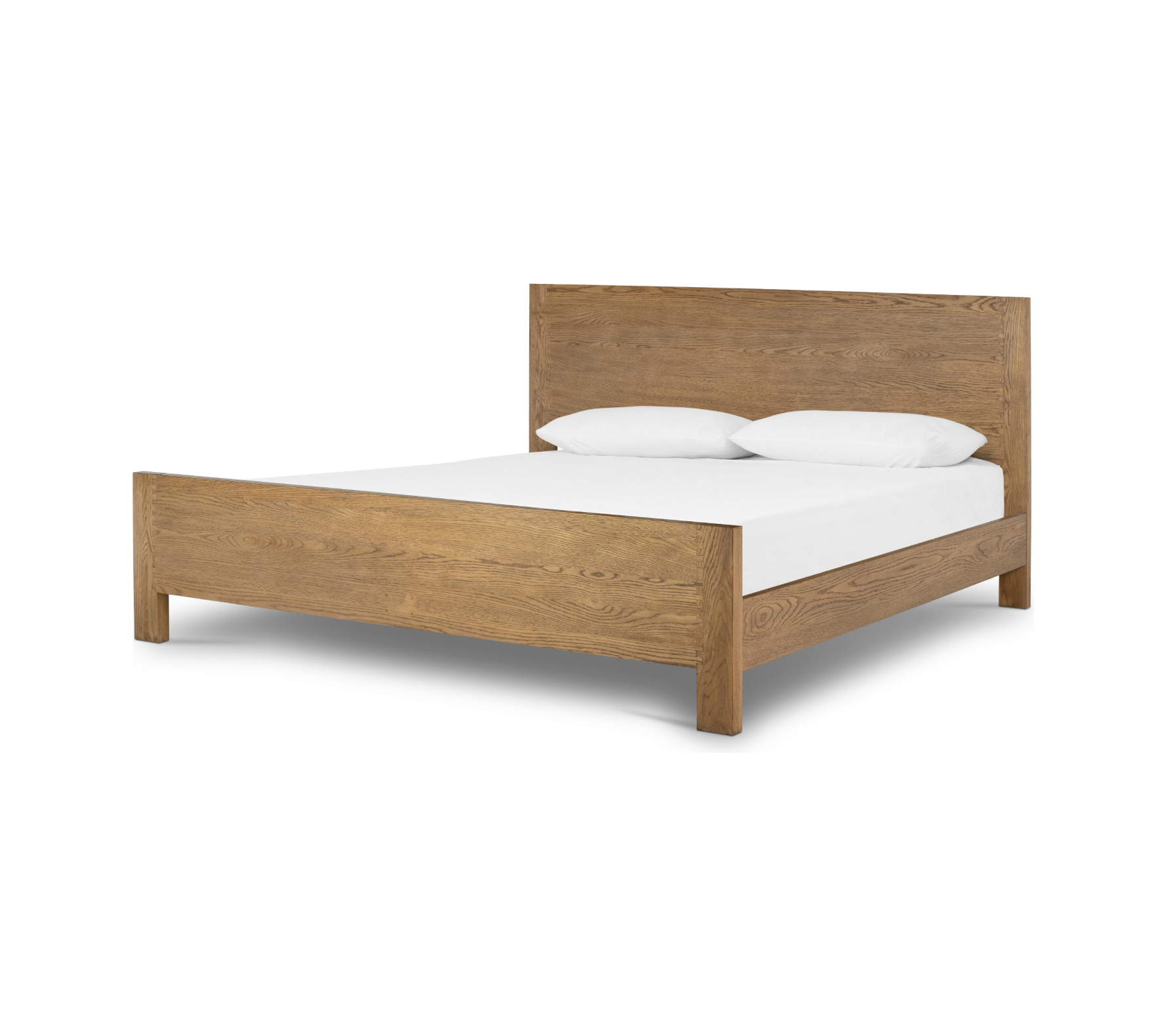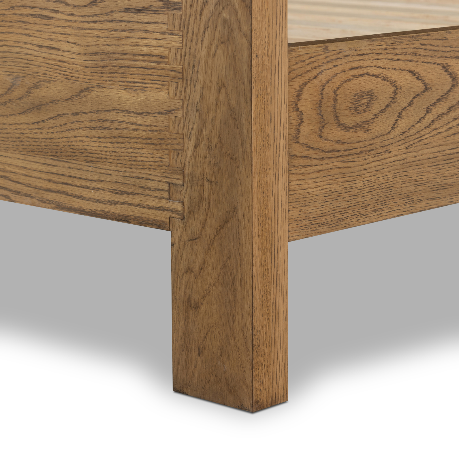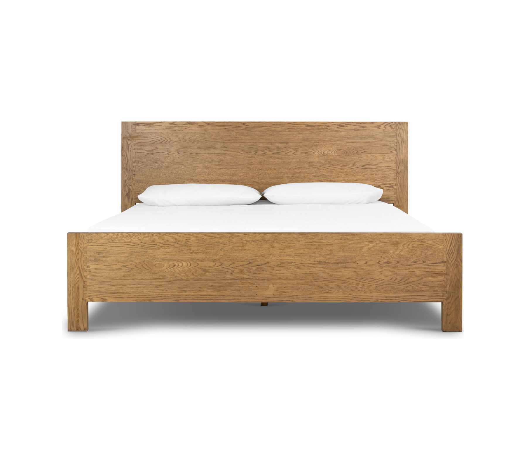 A simply shaped bed of warm-finished oak offers a handcrafted look inspired by midcentury design.