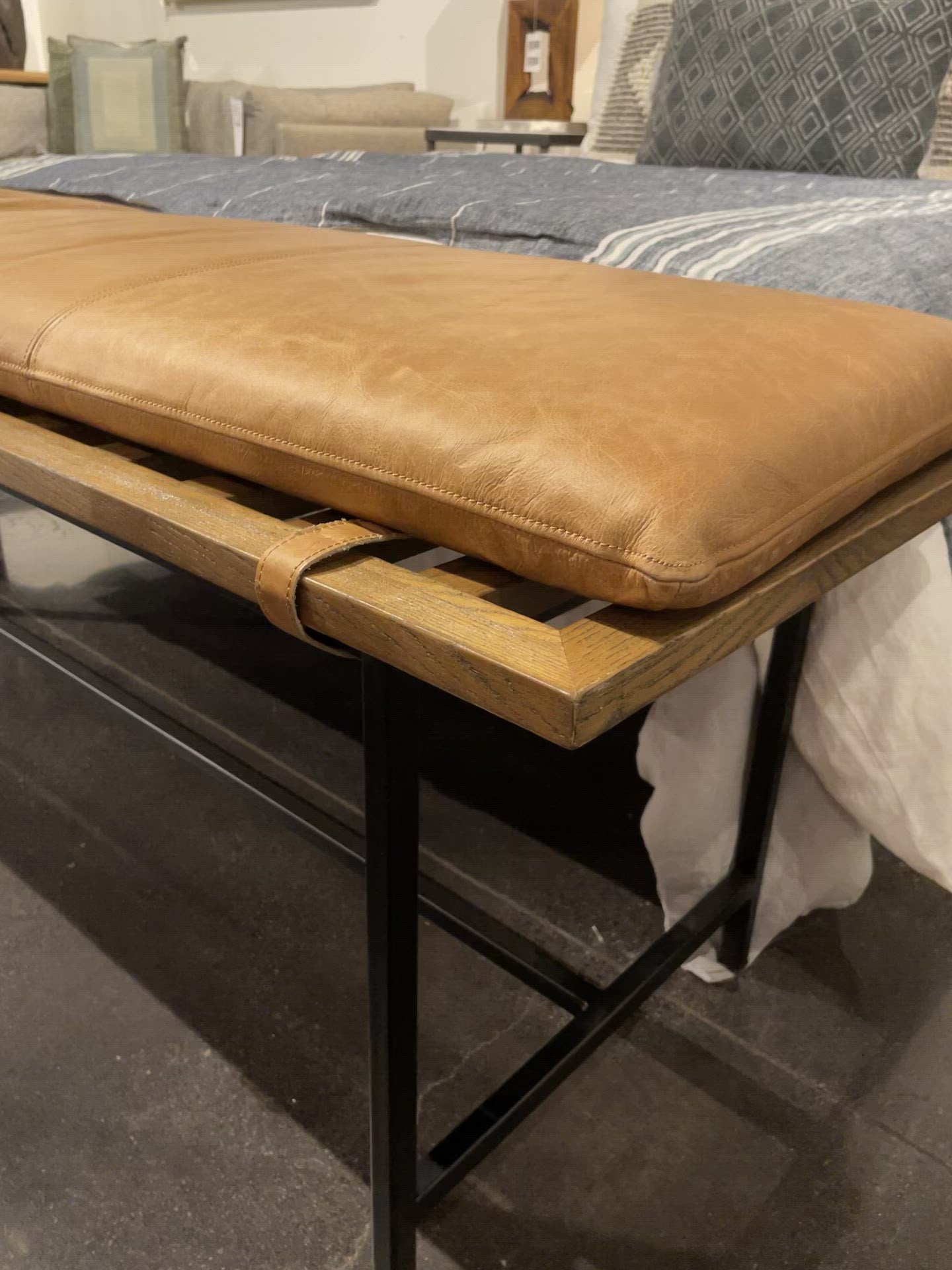 Featuring Gabine Accent Bench - Brandy by Four Hands at Amethyst Home. Airy, black-finished iron legs support a nettlewood dining bench of a chic, comfy layer of brandy top-grain leather on this Gabine Accent Bench - Brandy. A handsome piece to add to any bedroom, living room, or entryway.