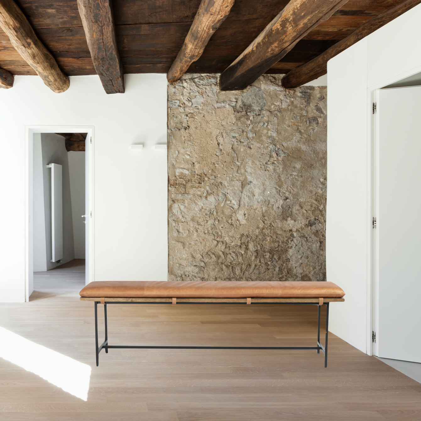 Airy, black-finished iron legs support a nettlewood dining bench of a chic, comfy layer of brandy top-grain leather on this Gabine Accent Bench - Brandy. A handsome piece to add to any bedroom, living room, or entryway.