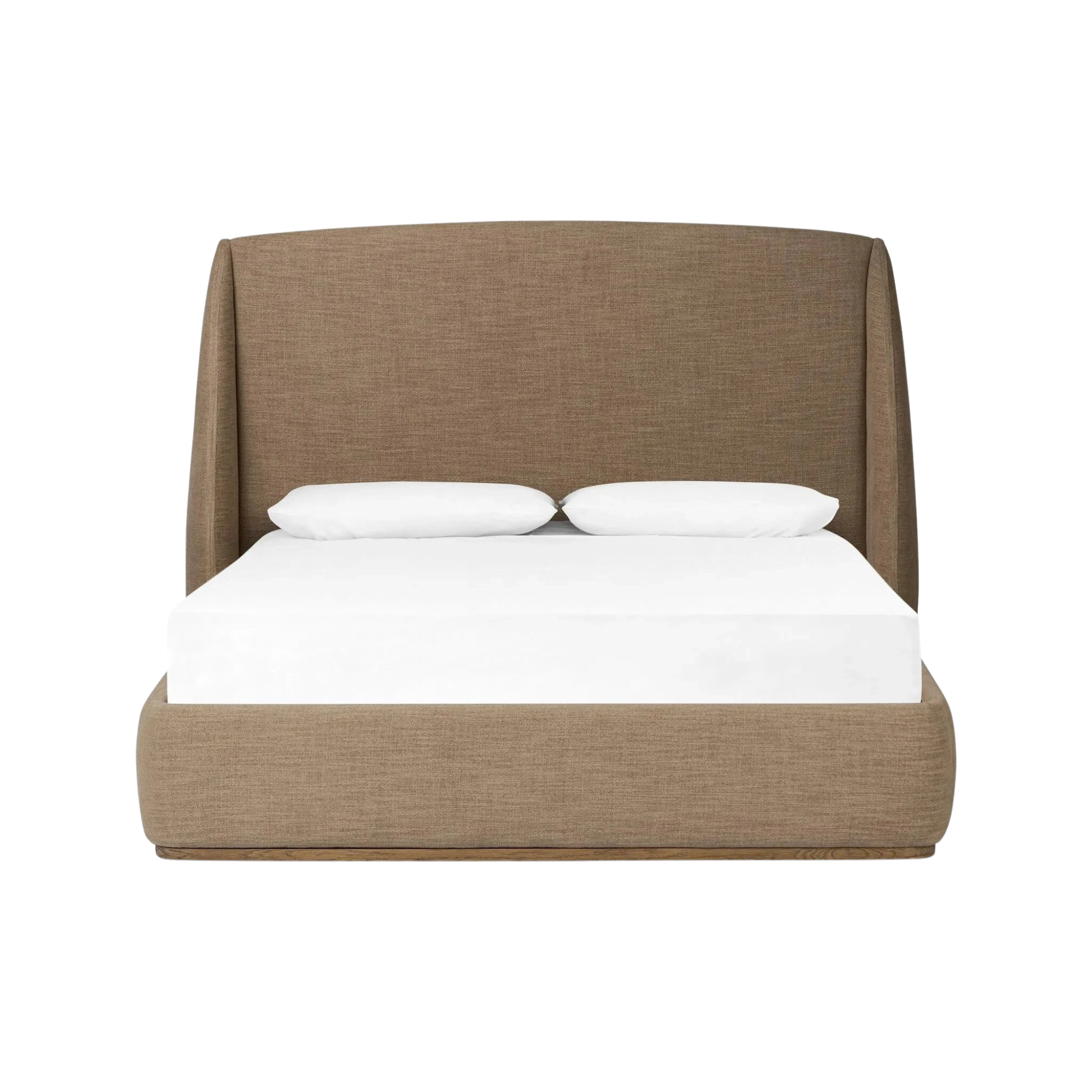 Featuring Maeve Laken Taupe Upholstered Bed by Four Hands at Amethyst Home. Clean lines meet contoured curves for a timeless bedroom look. A petal-shaped shelter overlaps side rails for a unique,  comforting silhouette. Fully upholstered in a versatile taupe that complements a wide range of color palettes. Overall Dimensions: Queen: