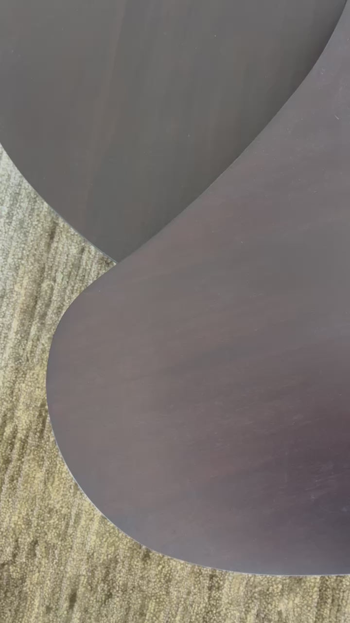Featuring Mahogany Boomerang Coffee Table - Small by Ethnicraft at Amethyst Home. Playful, pebble shapes set on a beautiful, folded, base. The Boomerang coffee table is a fantastic and well-proportioned addition to any space. Configured with the two sizes together, or as a stand-alone, this design is sure to capture attention.