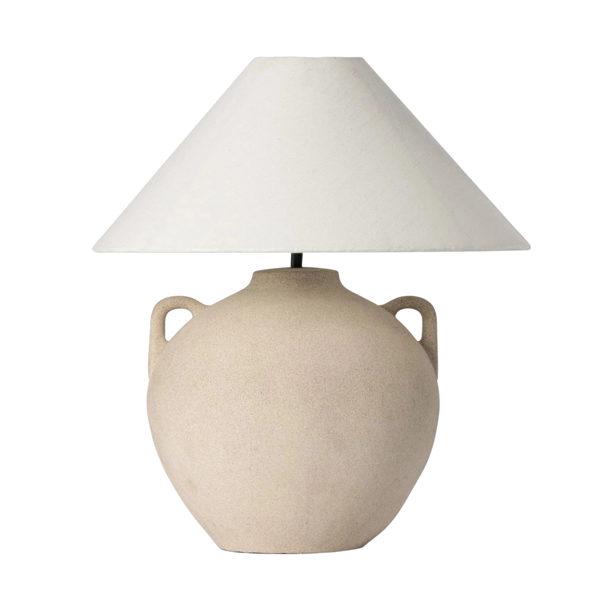 Inspired by vintage clay jars, a light sand-colored talavera lamp with handle-like detailing pairs with a tapered linen shade in a versatile ivory.