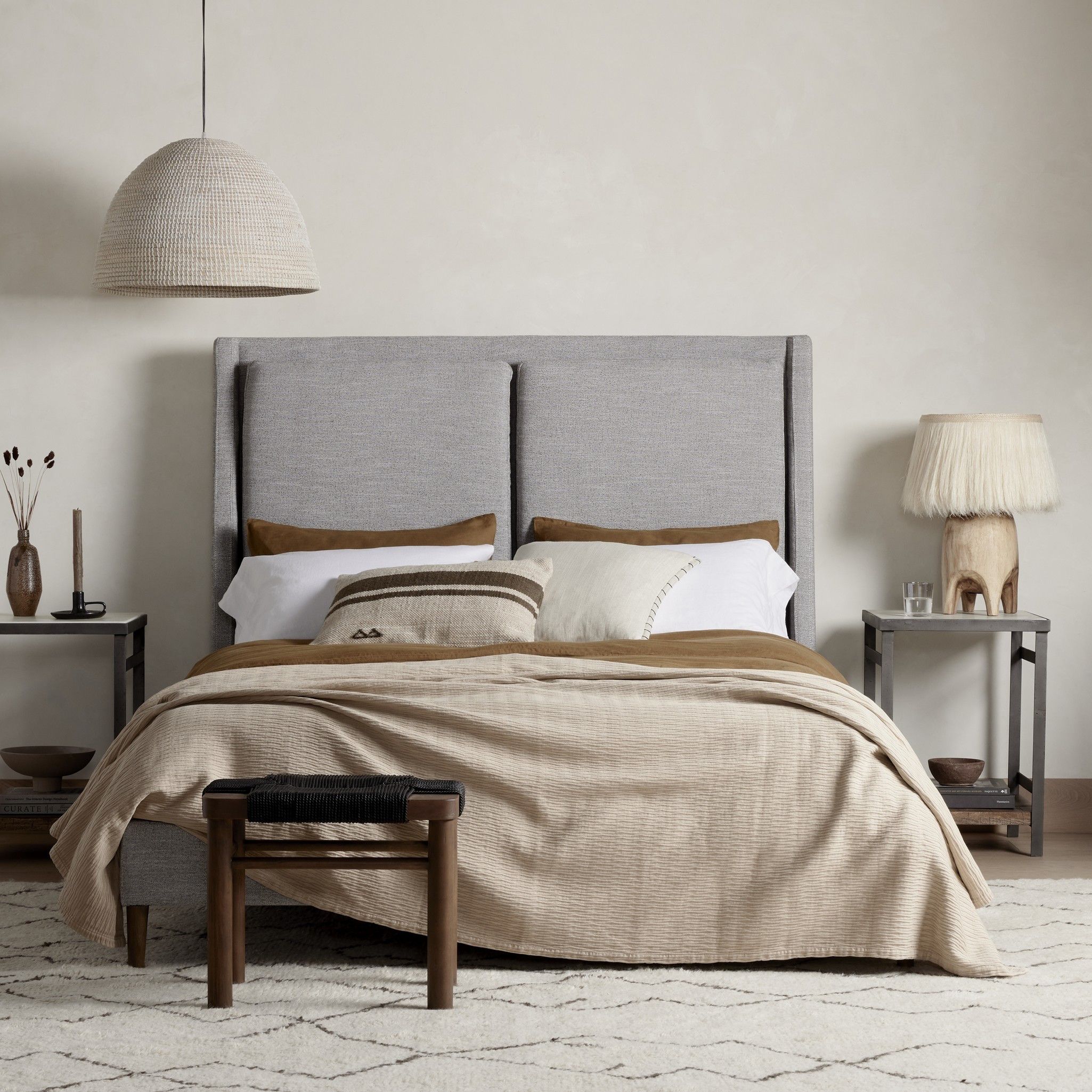 Featuring Potter Manor Grey Bed by Four Hands at Amethyst Home. Light, livable luxury. Upholstered in a grey synthetic-blend, a tapered headboard features fixed overscale pillows, for a calming look with great depth. Wire-brushed parawood legs lend a warm, natural finishing touch. Performance fabrics are specially created to withstand spills, stains, hig. Amethyst Home provides interior design, new home construction design consulting, vintage area rugs, and lighting in the Laguna Beach metro area.