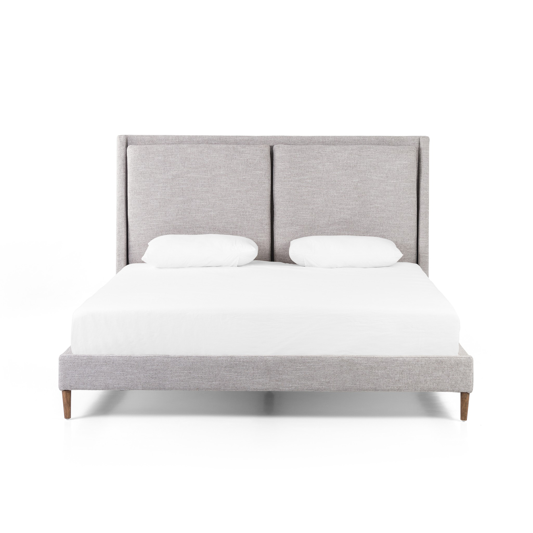 Featuring Potter Manor Grey Bed by Four Hands at Amethyst Home. Light, livable luxury. Upholstered in a grey synthetic-blend, a tapered headboard features fixed overscale pillows, for a calming look with great depth. Wire-brushed parawood legs lend a warm, natural finishing touch. Performance fabrics are specially created to withstand spills, stains, high t. Amethyst Home provides interior design, new home construction design consulting, vintage area rugs, and lighting in the Charlotte metro area.