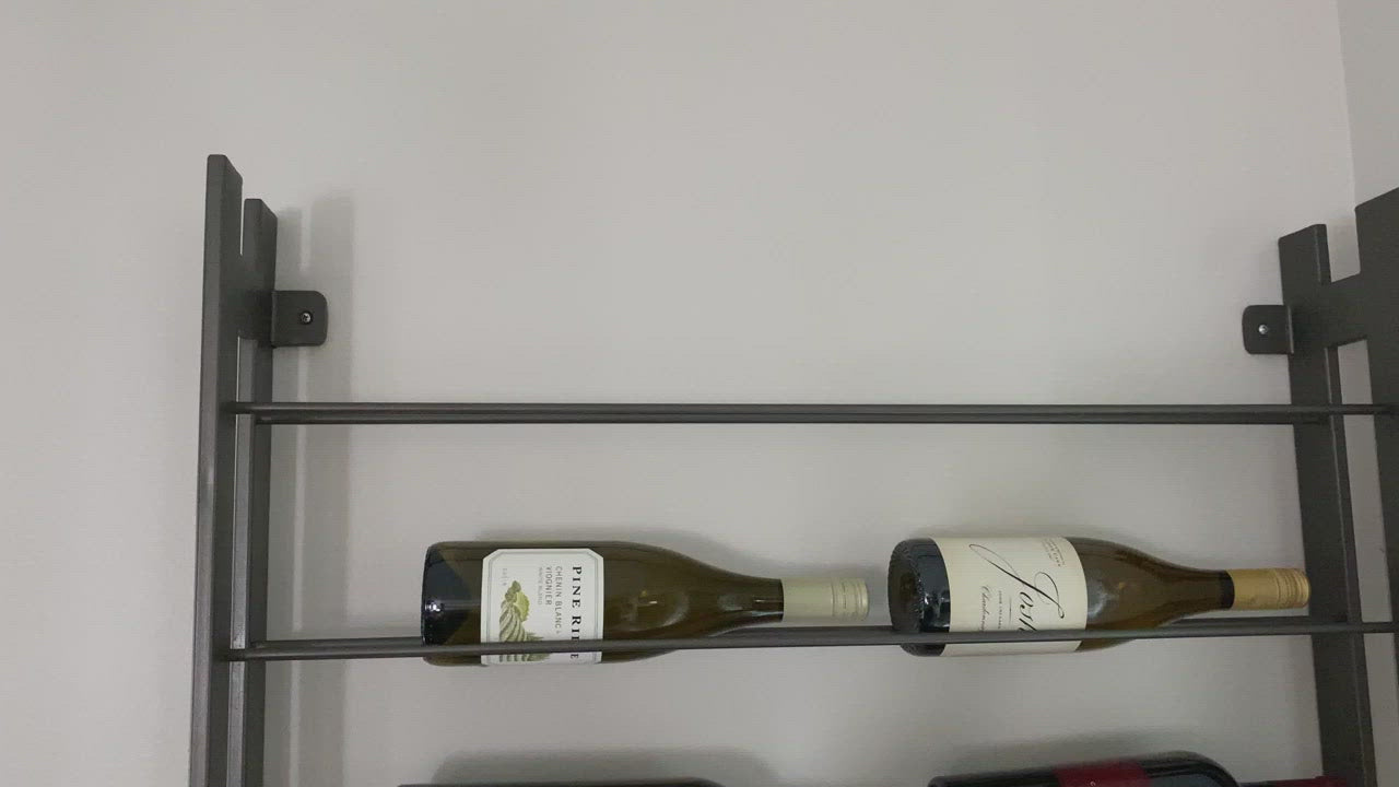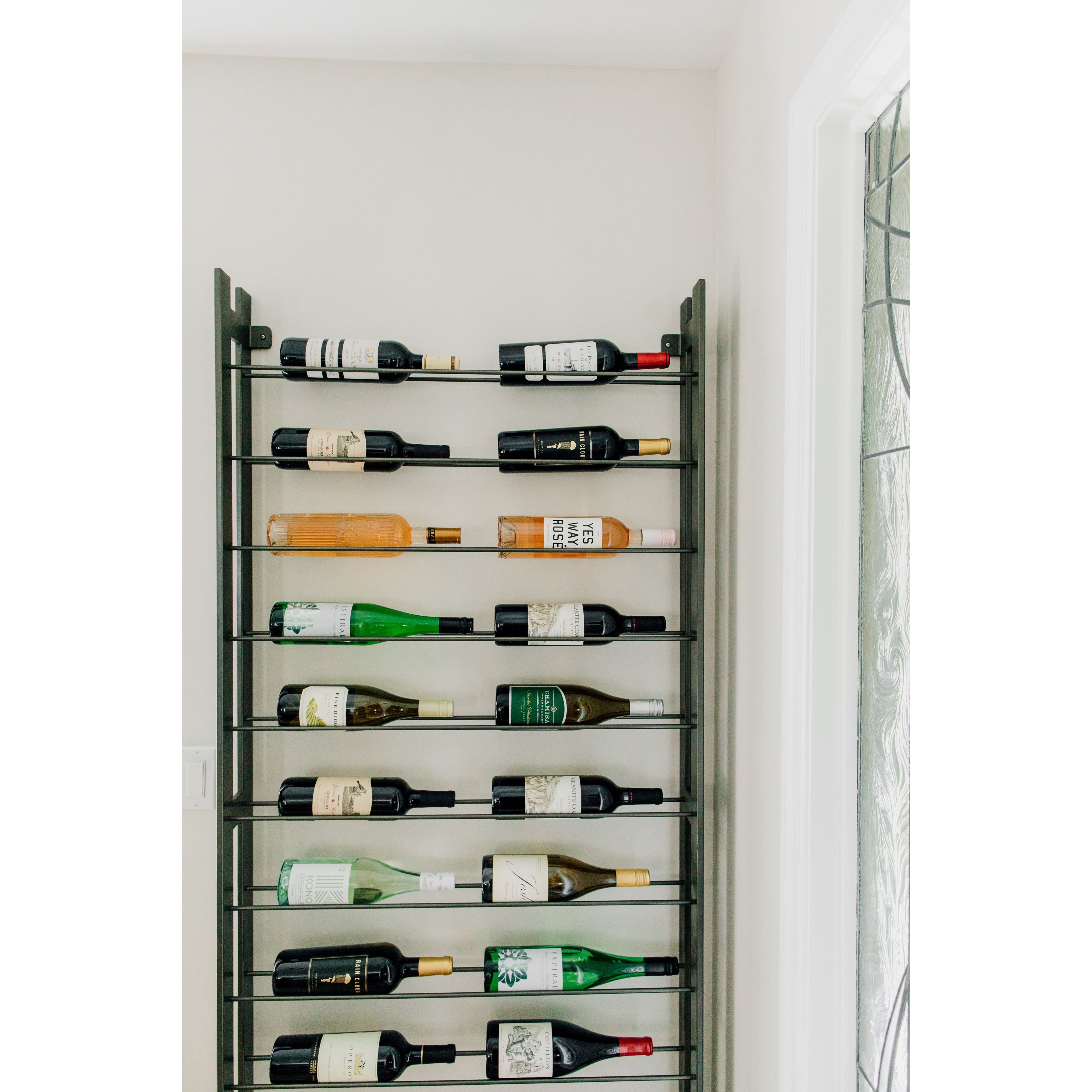 Store – and sip – in style. Tall, wall-mountable iron wine rack is finished in gunmetal, with open shelving for proper storage and stylish display of favorite wines. Anchors included.