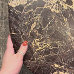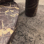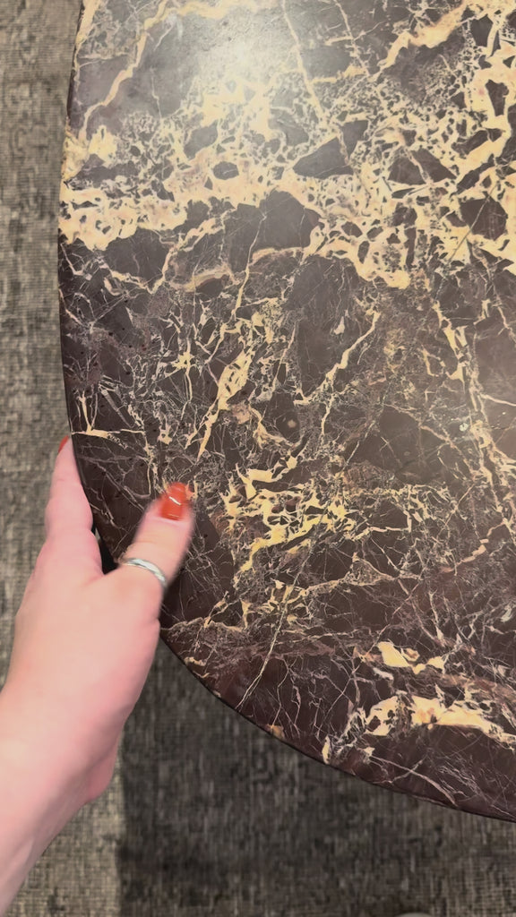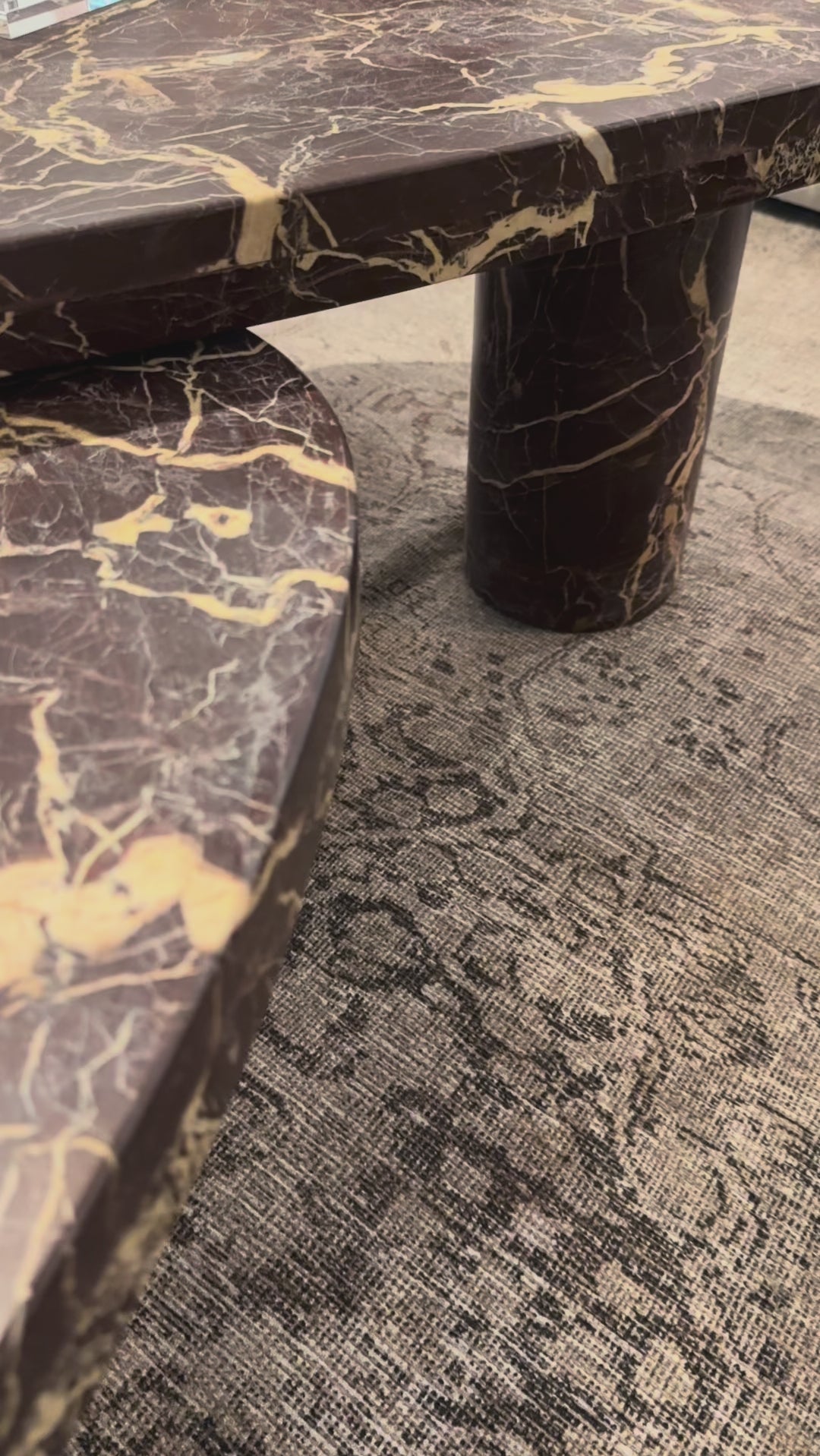 Shape and material share the spotlight in this tripod-style coffee table of solid marble. With turned, pillar legs and a rich merlot finish, with dramatic natural veining. Option to pair with smaller matching table for a nested look.